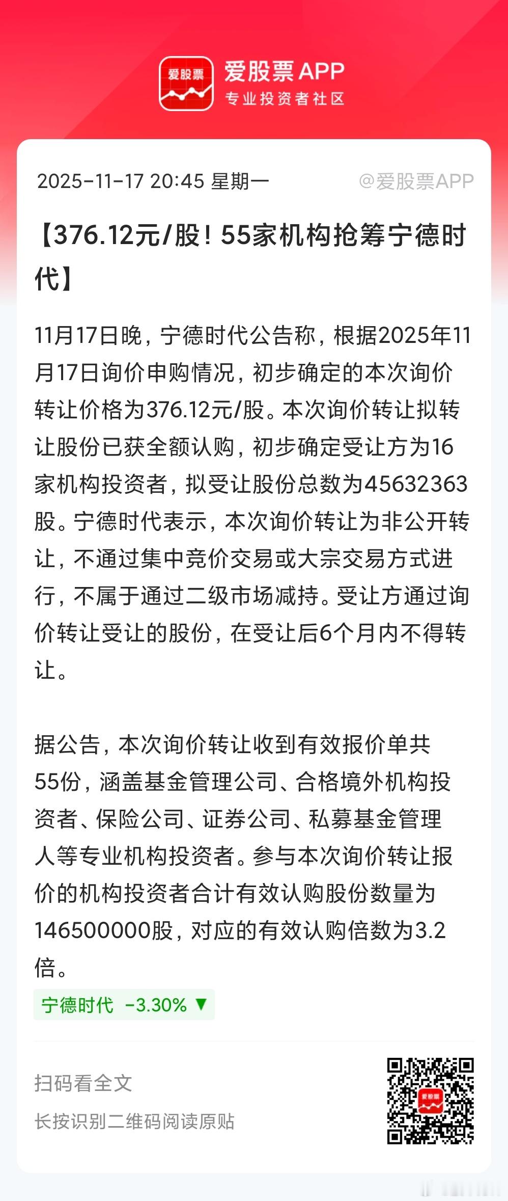 周末A股史上最大的个人减持,把今天宁德时代吓趴了,盘中一度跌超5%,收盘跌了3.3%。今晚宁王的询价结果出来了,共有55家机构参与报价,只有16家机构抢到了!转让价格定为376.12元/股,相比今天收盘价390元,只折价3.5%。说明机构都非常看好宁德,这对公司算间接利好。但刀锋不大理解,376元在二级市场大概率就能买到,机构为啥要去抢转让股份,还锁定半年不准卖呢!我不想猜测背后有啥猫腻,但这确实没多大利可图啊。