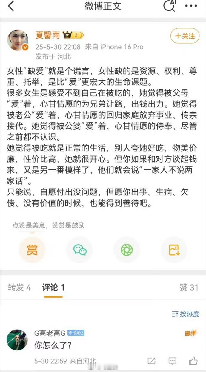 夏馨雨再次被禁言30天。这是第几次了?看看她这次发的和以往发的,像她这种账号,应