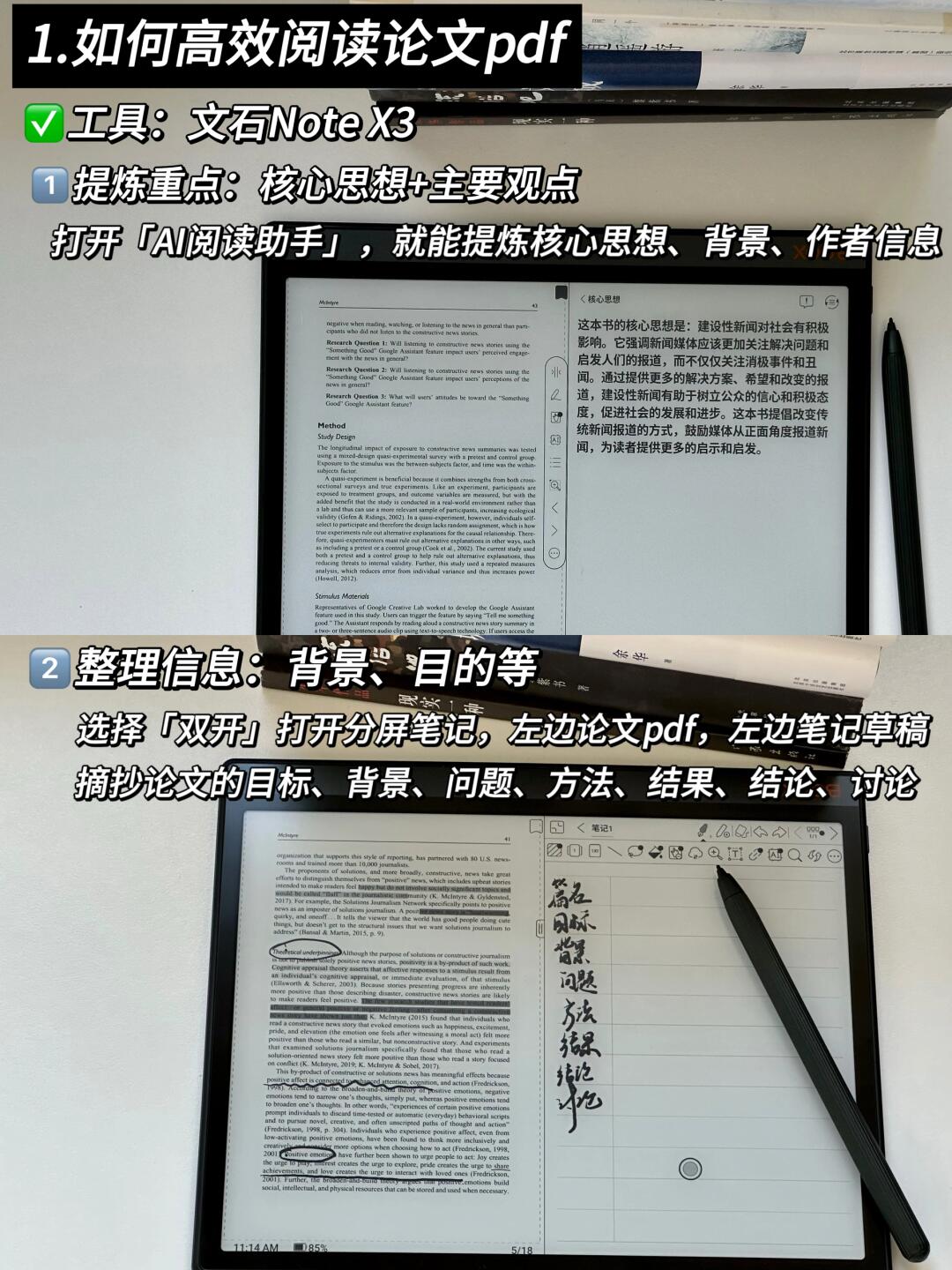 文石NoteX3看论文很香,先开启分屏左边打开文献,右边用自带笔记模板,摘抄目标、背景、问题、方法、结论、结果讨论。看新文献点开AI阅读助手,提炼核心内容+打开高效论文模式切分论文,边看边手写做批注,双击自动智能识别手写内容,文献整理更高效便捷