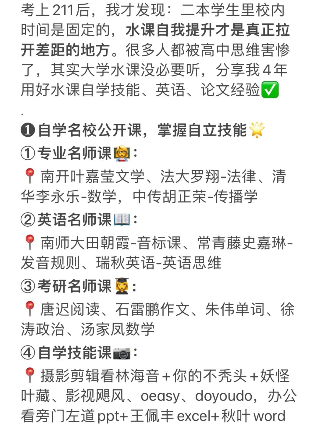 大一时我按部就班认真上课,但是期末认真复习却只考到89名。但我发现:学姐没认真复习却专业第1。原来她利用好水课,把四六级刷到600+、自学技能进入大厂实习。搞懂《水课才是拉开差距的开始」后,我也考到专业前3,研究生复试第1✅