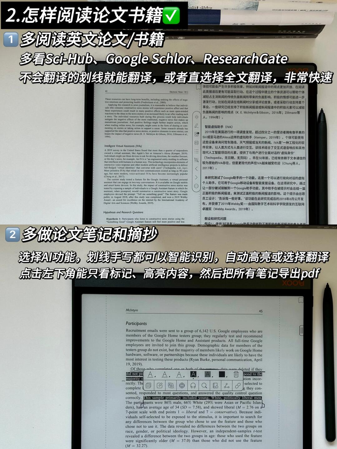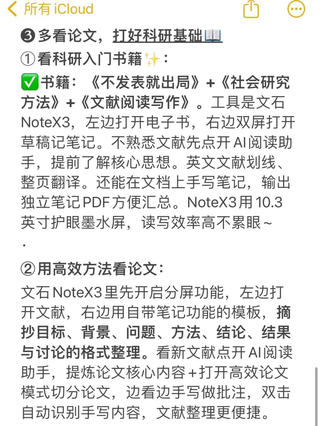 书籍:《不发表就出局》+《社会研究方法》+《文献阅读写作》。工具是文石NoteX3,左边打开电子书,右边双屏打开草稿记笔记。拿到不熟文献时,我先点开AI阅读助手了解核心思想,英文文献划线、整页翻译或单击查词。还能在文档做手写笔记,转换格式输出独立笔记PDF,方便汇总知识。NoteX3用10.3英寸护眼墨水屏,读写效率高不累眼