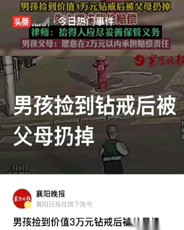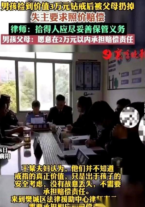 讲个事儿,听完你绝对会倒吸一口凉气。 一个3岁的娃,在小区花园捡了个“玩具”戒指,亮晶晶的,塞嘴里玩。他妈看见了,魂儿都吓飞了,一把夺过来,想都没想,直接扔进了垃圾桶。 结果,第二天,失主找上门了。 拿着监控,拿着发票,说:“你家孩子捡了我的钻戒,三万块。要么还,要么赔。” 孩子妈当场就懵了。 啥玩意儿?三万?一个玩具? 她当时唯一的念头就是,这玩意儿别卡着我儿子喉咙,赶紧扔了,扔得越远越好。谁能想到,扔掉的是一辆小汽车的首付啊。 失主也委屈。结婚三周年的纪念,心头肉一样。下班回家着急做饭,一不留神蹭掉了,回头找,已经进了垃圾桶,跟着垃圾车,奔向了它未知的远方。 一个觉得天降横祸,我就是个带娃的,家里男人在外头挣辛苦钱,我哪来三万块赔你这个? 一个觉得你弄丢我东西,天经地义就得赔,我管你是有意还是无意? 你说这事儿怨谁? 怨孩子好奇?他才三岁。 怨当妈的太大意?她脑子里想的都是孩子的安全。 怨失主自己不小心?谁还没丢过东西呢。 最后警察来了,社区也来了,一通调解。 结果是,各打五十大板。 你丢东西有错,你保管不当也有责。一家一半,赔一万五。 这一万五,对那个家庭来说,可能就是几个月甚至大半年的活命钱。 就因为一个“我以为”,一个随手的动作,付出了这么惨痛的代价。 这世上的事儿就是这么邪门。 有时候压垮一个普通人的,真不是什么惊天动地的大灾难。 就是一个小小的,亮晶晶的,你以为是玻璃碴子的玩意儿。
