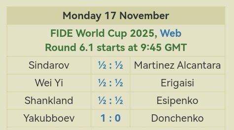 国际象棋世界杯 韦弈战平艾里盖西 11月17日,2025国际棋联世界杯赛第六轮(1/4决赛)两盘慢棋的第一盘,中国棋手韦弈31回合战平印度棋手艾里盖西。 其他棋手,雅库鲍耶夫战胜顿琴科;辛达罗夫0.5-0.5弈和马丁内兹;尚克兰德0.5-0.5战平艾西蓬科。