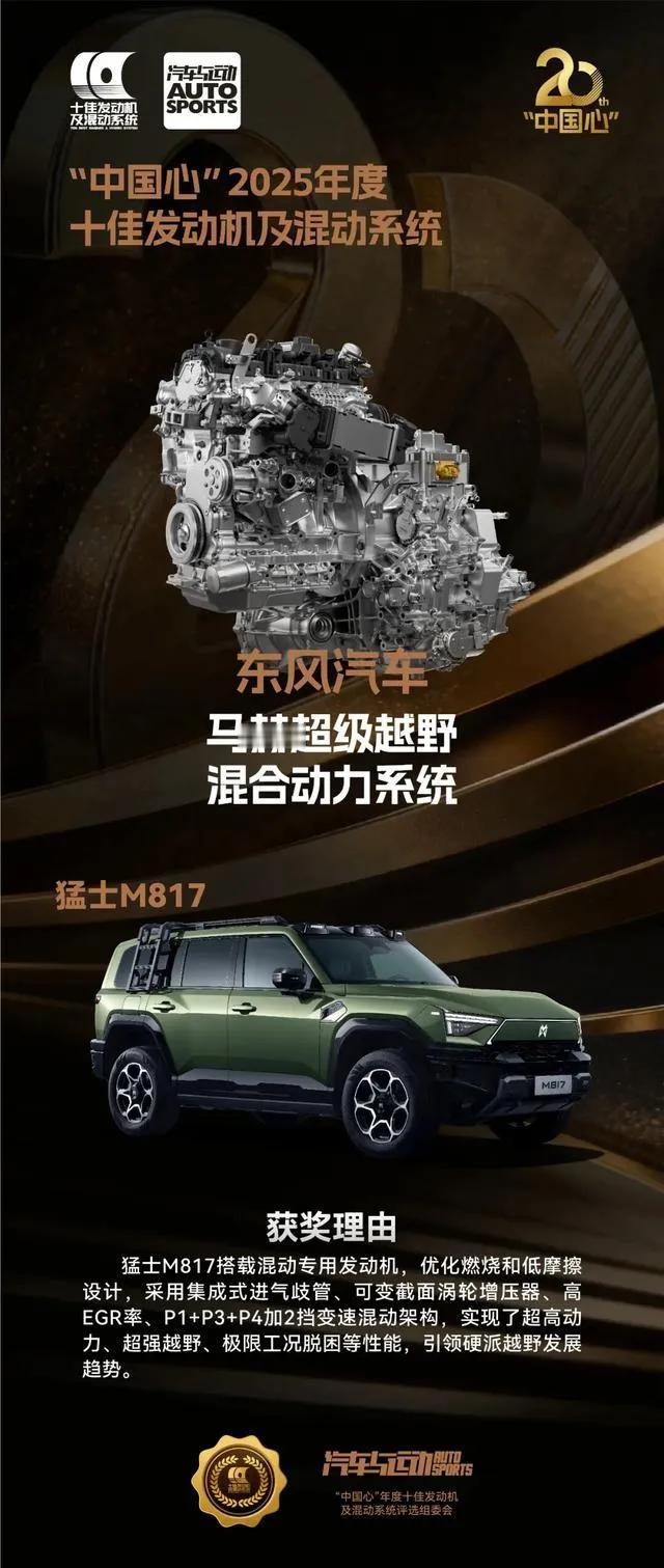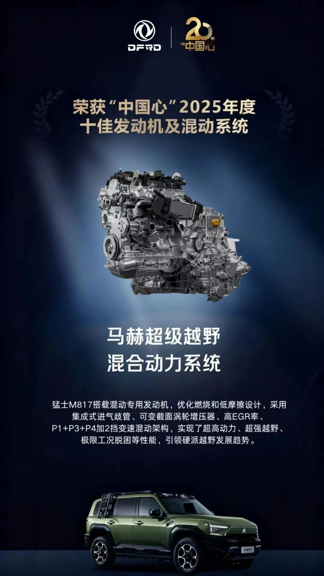 11月3日“中国心”2025年度十佳发动机及混动系统评选结果揭晓!图一是十佳名单,按首字母顺序排列,排名榜没有先后。其中国产车占据五席,合资车占据五席。 东风汽车自主研发的马赫超级越野混合动力系统斩获“中国心”2025年度十佳发动机及混动系统大奖。 东风马赫动力传承东风56年造车基因先后斩获6次“中国心”十佳动力,4次世界十佳奖项,10余款产品获得中汽中心权威认证并成为行业首个解锁混动、增程、纯电三大领域高品质奖项的动力总成品牌。 此次获奖充分展示了东风马赫动力在混合动力技术领域的领先地位,特别是其高热效率发动机和超长续航的越野混动系统,已成为行业技术发展的一个重要标杆。 今年9月,马赫动力全新自主研发的高热效率混动发动机成功将最高热效率提升至48%以上再度刷新行业纪录。 目前,马赫超级越野混合动力系统已率先搭载于东风猛士M817实现CLTC纯电续航215公里综合续航1365公里兼顾续航与性能的同时真正实现“可城可野可远方”的全能体验。