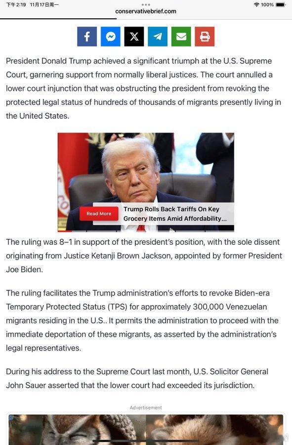 最新消息,川普总统在美国最高法院取得重大胜利,并且还获得了通常立场偏自由派大法官的支持。最高法院推翻了下级法院的禁令,该禁令原本阻止川普总统撤销目前在美国境内数十万移民的受保护合法身份。最高法院以 8比1 支持川普的立场,唯一的反对票来自由前总统乔·拜登任命的大法官凯坦吉·布朗·杰克逊(Ketanji Brown Jackson)。这一裁决将有助于川普政府撤销,拜登时期赋予约30万名居住在美国的委内瑞拉移民的“临时保护身份”(TPS),并允许政府如其法律团队所述,立即启动遣返程序。在上个月向最高法院发表陈述时,美国司法部总律师 约翰·绍尔(John Sauer) 表示,下级法院在该案中越权行事!