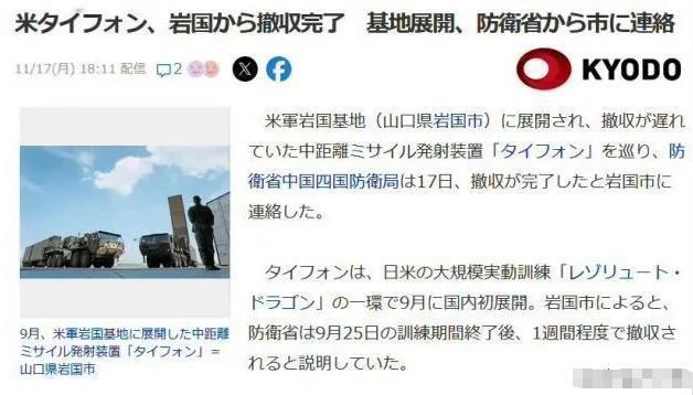 驻日美军突然宣布撤离“堤丰”中程导弹系统,这个节骨眼上撤离一直赖在岩国基地的中导系统是把小日子架在火上烤啊,狠狠地背刺。         11月17日当最后一批“堤丰”中程导弹发射装置离开日本山口县岩国市,一场搅动各方的风波才算暂时画上了句号,从登陆到撤离,虽然停留不久,却把地方的焦虑、盟友的算盘和地区大国的博弈都照得一清二楚。   这事的第一个震中,就在岩国市当地,这里本就是美海军陆战队的主要驻扎地之一,居民们对飞机噪音和复杂的社区关系早已习惯,但“堤丰”一来,性质全变了,这东西的打击范围远达2500公里,居民们心里门儿清:家门口突然变成了潜在的冲突最前沿,这可不是闹着玩的。   更让大家不安的是,日本防卫省当初承诺,这只是9月军事演习的一部分,训练一结束,最多一周就撤走,结果说好的期限过了快两个月,那些发射装置还赖着不走,这一下点燃了民众的担忧,谁都怕这“临时训练”最后变成“永久存在”,开了一个糟糕的头。   隔壁的广岛县和山口县市民团体坐不住了,作为一个被核武器伤害过的国家,民众对任何军事扩张都有着天然的警惕,他们在11月10日递交了正式申请,核心诉求就一个:赶紧催美军把东西弄走!这背后不仅是对生活品质的担忧,更是对和平历史的一种坚守,不能拿本地人的安全开玩笑。   对美国来说,这次部署就是一次精心策划的“战略试探”,他们想看看,自己快速部署中程火力的能力如何,日本这个“军事跳板”的承受力有多大,顺便也探一探周边国家的反应到底有多激烈。   而对日本政府而言,抱紧美国大腿,引进先进武器,能在同盟框架里增加点安全话语权;可另一方面,真要是擦枪走火,日本就可能被彻底卷进去,成为大国博弈的牺牲品,这种既想依赖又怕被拖下水的矛盾心态,贯穿始终。   所以最后的撤离,既是日本政府在内部压力下的妥协,也算是美国为了缓和局面,给未来的军事部署留点余地,所做出的策略性退让。   再把视野放大到整个亚太地区,自退出《中导条约》后,美国就急着在亚太构建一个陆基中导网络,用来威慑对手,而“堤丰”正是这盘大棋里的关键棋子。   但这种直接把导弹架在别人家门口的做法,无疑触碰了地区安全红线,中国和俄罗斯都对此表示了强烈反对,认为这是打着联合军演的幌子搞军备扩张,是典型的冷战思维,来自大国的严正警告,让美日不敢轻易越过底线。   所以这次撤离并不代表军事扩张的终结,美军那边放话“需要时可以重返”,日本近些年也在不断强化西南诸岛的军事力量,导弹的影子虽然暂时从岩国散去,但地区安全格局的脆弱性却暴露无遗。   真正的安全感,靠的不是部署了多少先进武器,而是大家能不能坐下来好好谈,否则今天一个“堤丰”走了,谁能保证明天不会有另一个“堤丰”,以更隐蔽的方式卷土重来呢?这个问题,值得每个人深思。