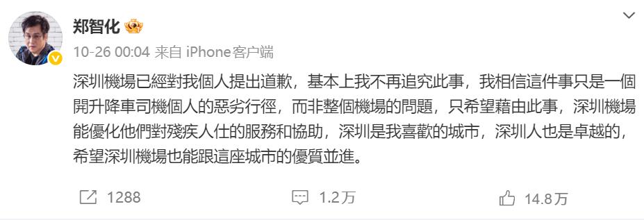 放过郑智化吧! 当你切身处地的换位思考一下,“连滚带爬”其实就很容易理解了。 郑智化10月25日14:39登上飞机,14:59就发出微博。 可见他当时真是气愤到一定程度下的发泄,而不是深思熟虑后的抹黑。 郑智化进机舱的视频确实不像他说的“连滚带爬”,深圳机场的服务也没有“没人性”。 但深圳机场升降车与机门间的25公分的落差是实实在在的,对残障人士的拦阻也是实打实的。 作为一个有明星光环的残障人士, 郑智化希望的登机是:不用惊动任何人,一个人操纵轮椅就把事情办了。 但是当时的条件不可以,他只能被提溜起来,被工作人员兴师动众地腾挪进机舱。 这对他来说本身已经是一种屈辱了。 打个比方:就好像一只鼻涕虫在黑暗角落安安静静地流着鼻涕,突然被闪光灯照射公布在大家面前,看!它好脏啊! 但很多人无法理解这种“本可以自力更生,却被迫依赖他人”的屈辱感。 大多数健康人对于此事的感受是:残障人士本该寸步难行,但那么多人“服侍”你,让你顺利登机,你还有什么不满意的?不说感激还愤怒什么?是不是有点矫情? 但残疾人的认知是什么?这个社会本应有我的容身之地,本应为我提供方便,以便我能独立自主,而不是整出一大群人围着我,让我看起来像是一种拖累。 国际残疾人联盟与麻省理工数据实验室在《残疾人:从统计可见度到权利行使(2025)》报告中指出,全球残障人口占比15%,约12亿人。 就中国而言,残障人口约8500万,占全国总人口的6.34%,也就是说每100人中就有6个残障人士,但很奇怪的是,我们的生活中好像很少看到残障人士。 是家里太好不舍得出门吗? 郑智化事件是一个很好的契机,残疾人士出行难的普遍困境被曝光出来,我们国家对此的重视程度很显然是不够的,是有待提高的。 这是一件好事,希望大家不要把关注重点放在“围剿”郑智化身上,关注残疾人士出行难才是重点。