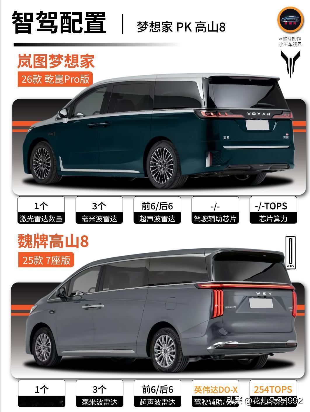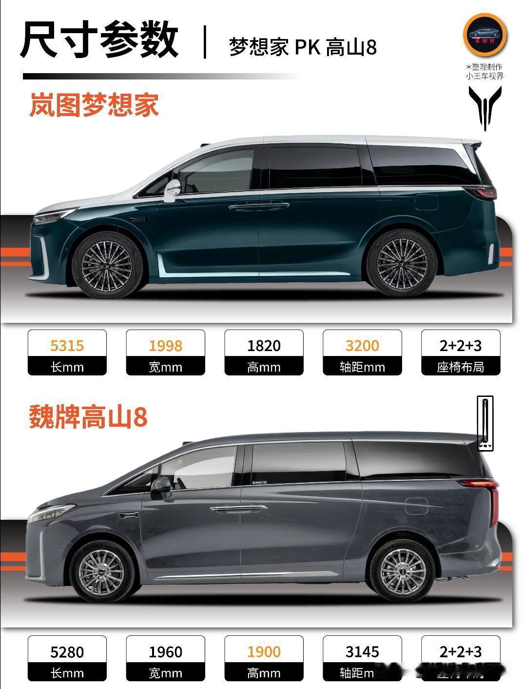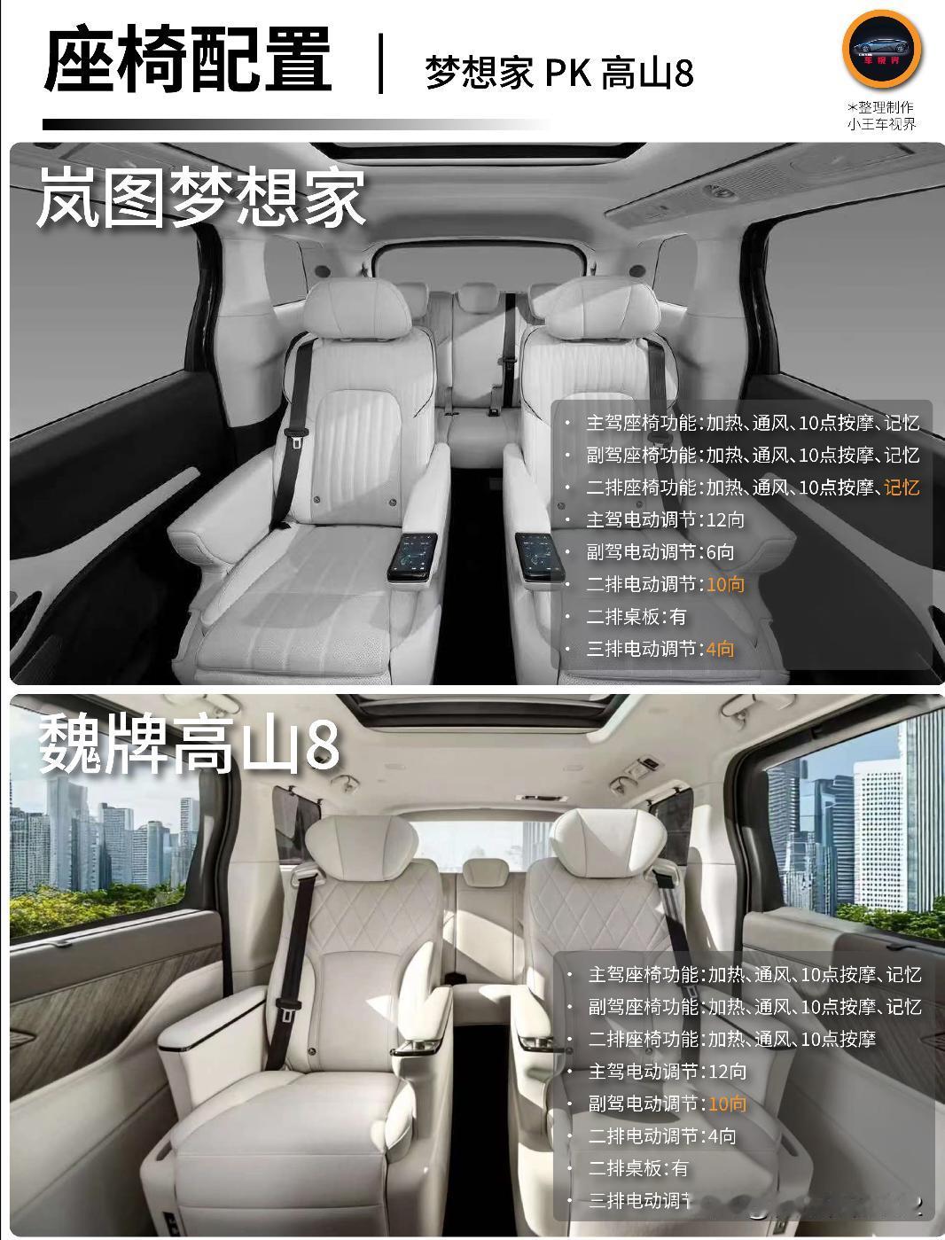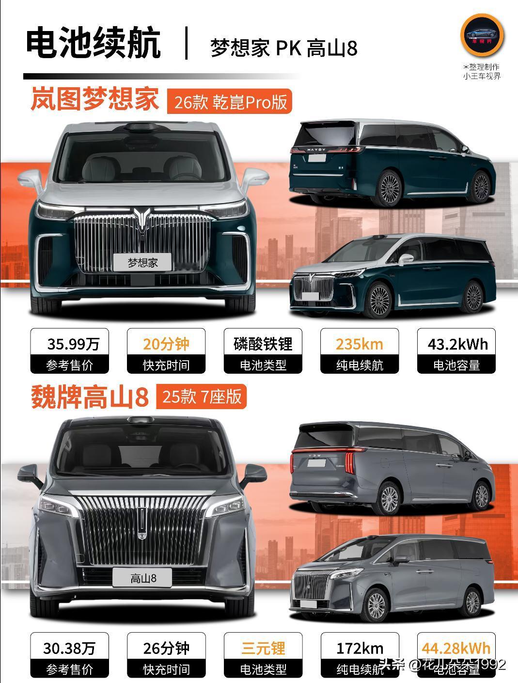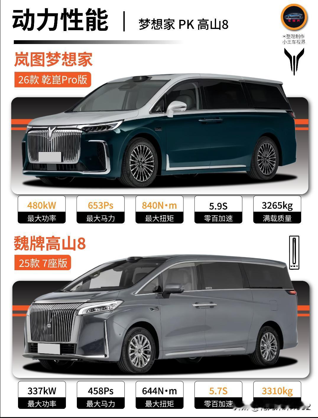 MPV才是家庭用车最终归宿! 如果你在这两台高端MPV之间纠结,我来帮你快速捋一捋它俩的区别: 1.空间尺寸: 梦想家是“大平层”,车长超5.3米,轴距3.2米,后备箱2700L的容积,气场十足。 魏牌高山8是“标准豪宅”,车长5.28米,轴距也超3.1米,空间也很宽裕。 2.底盘用料: 梦想家直接给你“魔毯”体验,全系标配空气悬架+CDC+后轮转向,过弯过坎都更稳。 高山8的底盘采用前麦弗逊、后五连杆全铝悬架,并配备HRS液压减震技术,兼顾舒适与操控。 3. 车机智驾: 梦想家乾崑版是“华为技术派”,搭载鸿蒙座舱5和华为乾崑ADS 4高阶智驾,城市里也能自己开。 高山8用的是Coffee Pilot Ultra系统,具备“车位到车位”的智能辅助驾驶能力。 4. 内饰座椅: 梦想家第二排是零重力座椅,三排全带加热通风。 高山8的座椅功能也很全面。 总的来说,岚图梦想家更像一位科技拉满的“全能管家”,而魏牌高山8则是一位务实的“贴心伙伴”,根据你对智能和舒适度的偏好来选就行
