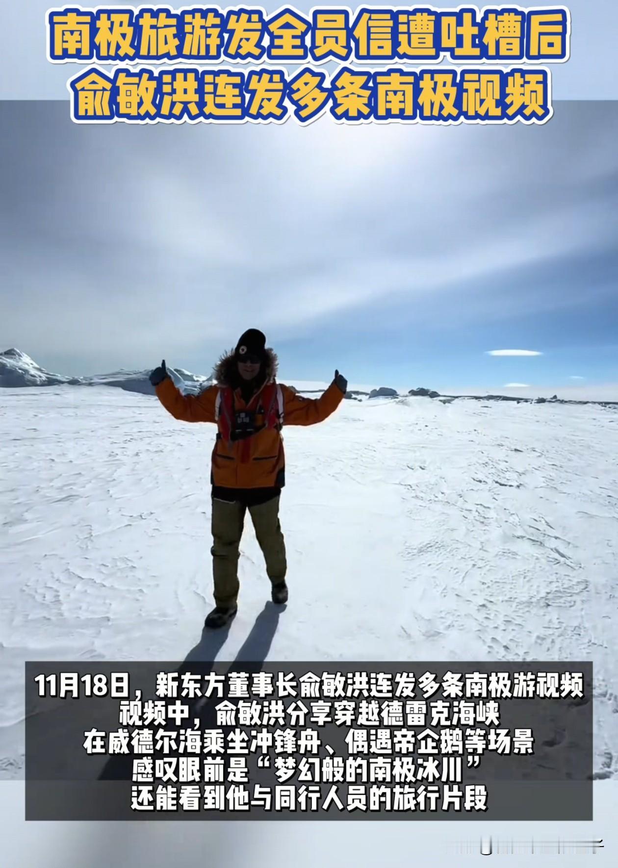 真替俞敏洪感到委屈! 63岁的他估计怎么也想不明白, 都已经到退休的年龄了,就因为发了个旅游的视频,居然自家的员工被吐槽上热搜了。 有网友说,话说难听点,就算现在俞老师现在把公司原地解散,也不影响他周游世界,而员工可就连工作都没了。 在昨天发“鸡汤文”被吐槽后,俞敏洪没有选择低调,也没有发文解释,而是在今天上午,又连续更新了了10条他在南极游玩的视频。 估计俞敏洪也认为自己做得没错,员工有什么资格抱怨老板不该去旅游,就是要继续更新。 个人认为,“吃得苦中苦,方为人上人”,俞敏洪的成功也是靠自己打拼换来的,一路走来很不容易,到了这个年纪放松一下,开心一下,都是很正常的事情,没必要上纲上线,您觉得呢?
