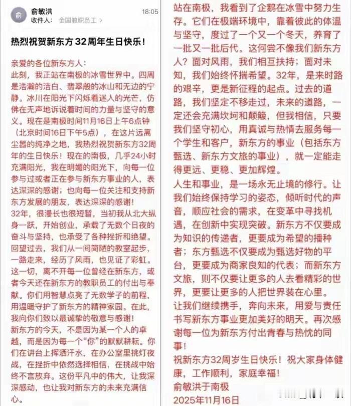 俞敏洪的诗和远方为什么让人反感? 真被董宇辉说中了! 搁现在看,不就是现在打工人的真实写照嘛。 董宇辉2016年送给学生的话,他说“你晚自习时,地球极圈可能正在五彩斑斓”“你在书桌前埋头苦读时,极圈正飘着极光,大洋上有鲸鱼跃出水面”。 俞敏洪最近在南极看极光、喂企鹅,新东方员工在工位改方案、赶deadline,世界那么大,老板替你们去看看,这波操作直接给打工人整懵了! 更绝的是,俞敏洪还发了封长长的全员信,分享南极感悟、畅谈“探索精神”。可打工人心里门儿清:职场哪是啥温情大家庭啊,就是你给钱我干活的等价交换!你在南极吹冷风看企鹅,我在公司当牛马熬大夜,你的诗和远方,跟我的房贷车贷半毛钱关系没有,你让一线员工咋共情啊? 说白了,打工人要的从来不是老板的心灵鸡汤,而是准时发的工资、该给的加班费、不被随便占的休息时间,还有能看见的晋升路。 老板享受生活没啥毛病、无可厚非。老板们与其分享远方,不如多听听员工的心声。 俞敏洪