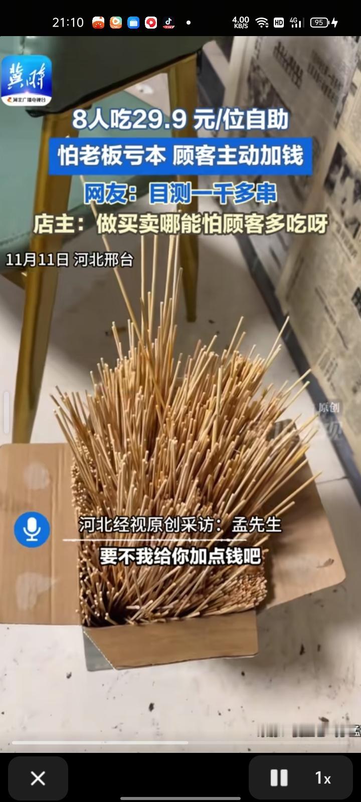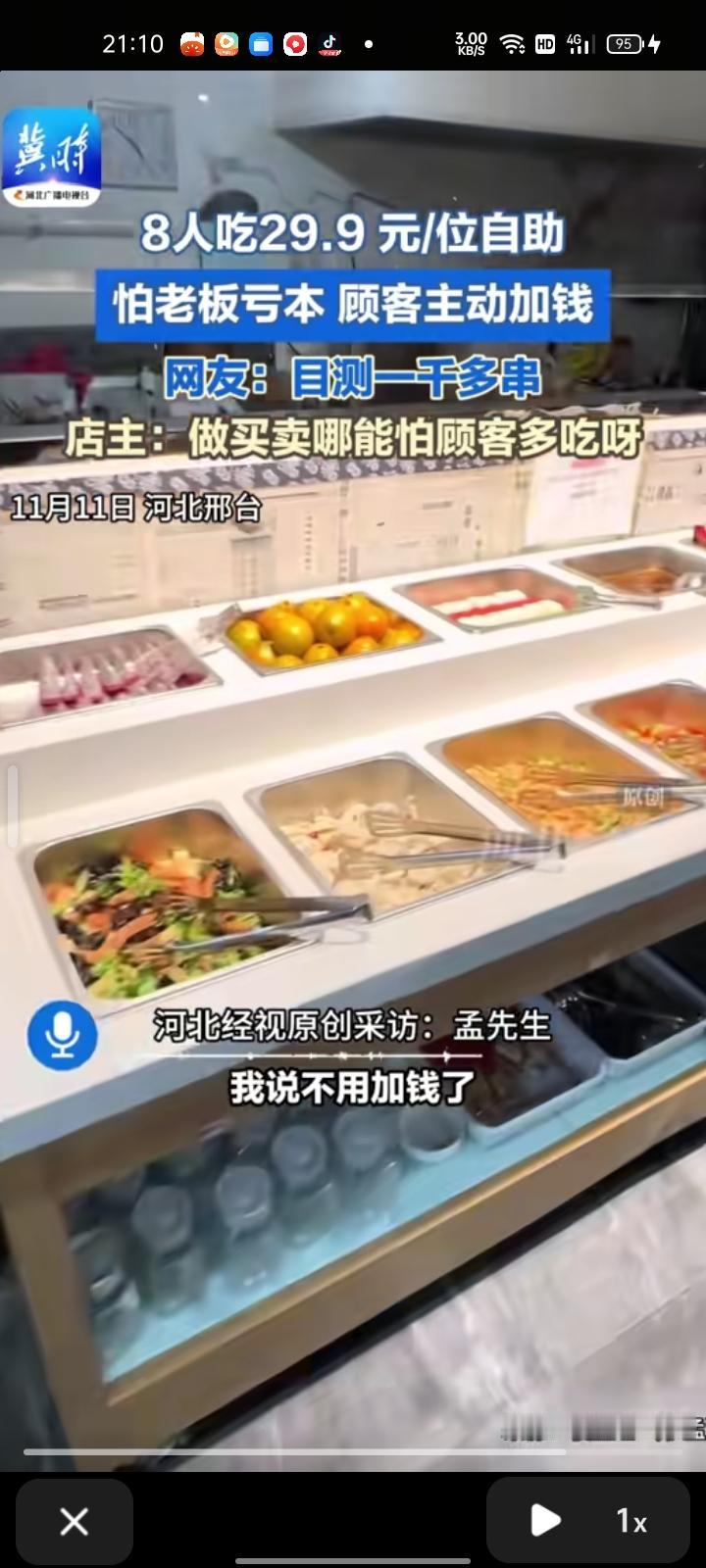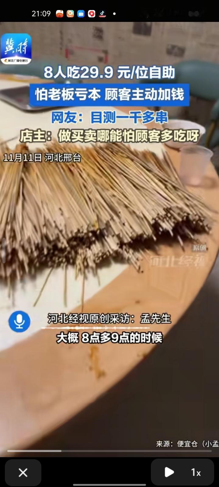 “骨子里的善良!”11月15日,河北邢台,8人去吃29.9元一位的自助火锅,众人大约吃了1000根串串,担心把老板吃亏本了,其中一名男子主动要求多付点钱,没想到老板也很实在,表示做买卖的哪能怕顾客多吃!网友:都是讲究人! 11月15号那个周末晚上,正是饭点最热闹的时候。孟老板的自助火锅店刚翻了一轮台,就进来八位看着挺豪爽的大哥,径直走进了包厢。店里的规矩明明白白,29块9一位,串串、小菜、饮品随便造,主打一个实惠亲民,来的大多是附近街坊和回头客。 自助火锅这东西,素来有个不成文的小默契:食客总想着多吃点贵的“回本”,老板则靠着客流平衡成本。可这八位大哥,硬是把这份默契换成了暖心的体谅。他们吃得是真尽兴,几个人边聊边涮,竹签子一根根往空盘里放,到最后,不仅桌上堆成了小山,连旁边空着的啤酒箱都被装满了,孟老板后来粗略一数,足足近千根串串。 换作别的店家,看着这阵仗或许会暗自心疼成本,可这八位大哥餐后的举动,却让孟老板愣在了原地。结完账刚要走,其中一位大哥又折了回来,找到正在收拾桌子的孟老板,手里还攥着几百块现金,语气特别诚恳:“老板,咱这顿吃得太多了,你这29块9一位的定价,肯定得亏。这钱你拿着,不能让你做赔本买卖。” 孟老板说自己当时第一反应是“傻了”,不是因为心疼成本,是真没见过这样的顾客。做自助这么久,见过嫌菜少的、挑毛病的,唯独没见过吃多了主动要加钱的。 他缓过神来,赶紧把钱推了回去,笑着摆手:“大哥您这就见外了,开门做自助生意,哪能怕客人吃得多?我这模式早算过账,有人吃得酣畅,也有人吃得清淡,总不能人家吃少的时候我退钱,您吃得多我就多要吧?” 大哥们见孟老板态度坚决,实在拗不过,只好把钱收了回去,可脸上满是不好意思。孟老板看着他们的样子,突然灵机一动:“大哥们要是真觉得过意不去,不如帮我个小忙,拍段视频夸夸我这店,比给我加钱还强。”这话一出,几位大哥立马答应,对着镜头实实在在地说:“老板实在,串串新鲜,29块9吃到撑,这样的店必须火。” 孟老板没多想,把这段朴实的视频发在了自己的社交账号上,没想到一夜之间就火了。视频里没有华丽的剪辑,只有堆成山的竹签和双方真诚的对话,可就是这份真实,戳中了无数网友的心。 评论区里全是清一色的点赞:“都是讲究人,这才是买卖该有的样子”“老板通透,顾客厚道,活该这家店生意好”“29块9吃的是火锅,暖的是人心”,还有不少邢台本地网友说“这就去打卡,支持实在人”。 其实孟老板开这家店没多久,当初定29.9元的价格,就是想做街坊生意,图个薄利多销。他说自己最看重的就是“实在”二字,食材每天现串,不新鲜的绝对不上桌,客人吃得开心,才会常来。这次遇到主动加钱的顾客,他觉得是自己的运气,“我以诚待人,人家自然也会体谅我”。 而那八位大哥后来也没当回事,在他们看来,“吃人家的东西,不能让人家亏着”是再简单不过的道理。有网友翻出其中一位大哥的留言,他说:“咱工薪阶层挣钱都不容易,老板开个小店更难,29块9能吃到这么多东西,已经够良心了,总不能因为自己能吃,就让人家白忙活。” 这事儿之所以能火,说白了,是戳中了大家对“真诚”的渴望。现在不少消费场景里,总少不了算计和提防,商家怕顾客占便宜,顾客怕商家玩套路。就像有网友说的:“平时去吃自助,都小心翼翼怕被老板瞪,哪见过老板怕客人没吃好,客人怕老板亏太多的?” 事件发酵后,孟老板的店彻底成了“网红店”,每天来打卡的人排起长队,不少人进门就说“我是看视频来的,就想支持实在老板”。孟老板没趁机涨价,反而加了不少菜品,还特意在门口贴了张告示:“不管吃多少,都是29.9元,放心吃,管够!” 有人说孟老板“有格局”,用一顿火锅换来了源源不断的客流;也有人说八位大哥“善良得可爱”,用几百块钱诠释了什么是体谅。可在他们自己看来,这不过是件再平常不过的小事,老板守着做生意的本分,顾客怀着做人的厚道,仅此而已。 如今再提起这事儿,孟老板还是笑得特别实在:“现在不少老顾客来,都特意提这八位大哥,说要向他们学习。其实不用学,大家多一份体谅,买卖就好做了。”而那些专程来打卡的食客,吃的也不只是串串,更是这份人与人之间最朴素的温暖。 29.9元的自助火锅,近千根串串,一场主动加钱的误会,最终变成了一段暖心的故事。这也让我们明白,最好的商业关系,从来都不是单方面的算计,而是你体谅我的不易,我回馈你的真诚。就像网友说的:“这样的老板和顾客,都值得最好的运气。” 素材来源:河北经视
