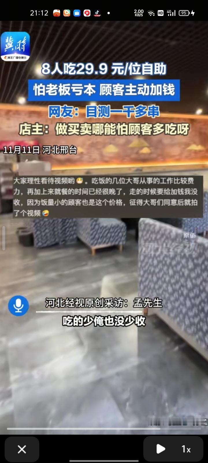 “骨子里的善良!”11月15日,河北邢台,8人去吃29.9元一位的自助火锅,众人
