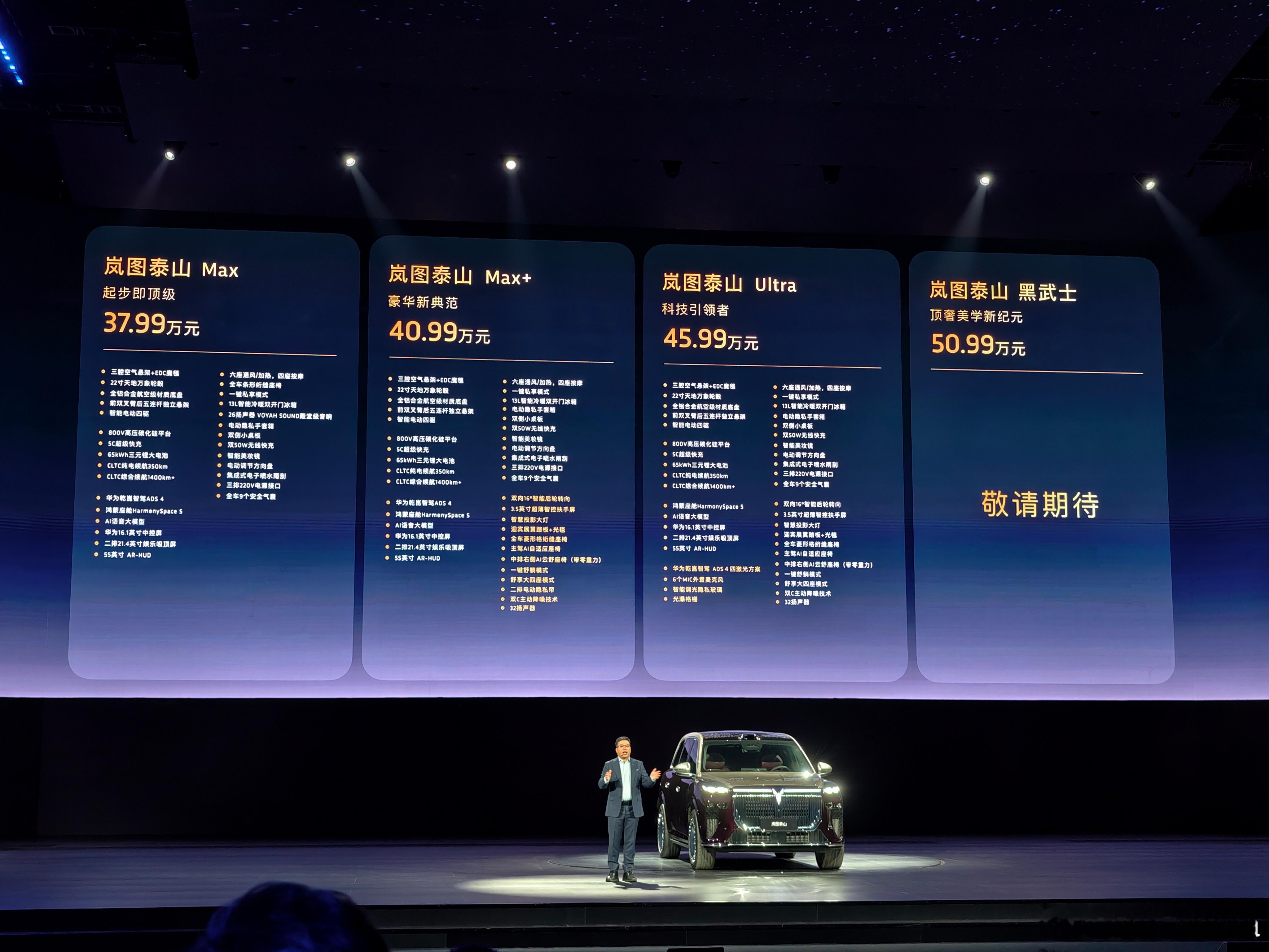 岚图泰山有三个sku,最低的MAX版起步价37.99万。标配:——三腔空气悬架——EDC魔毯底盘——华为乾崑ADS 4 + 鸿蒙座舱 5——65度大电池——800V + 5C超快充——22寸天地万象轮毂——6座通风+加热+4座按摩。更何况,岚图在【安全】和【驾控】上一直是第一梯队。核心竞品:问界M8,起步价35.98万问界M9,起步价46.98万理想L9,起步价40.98万