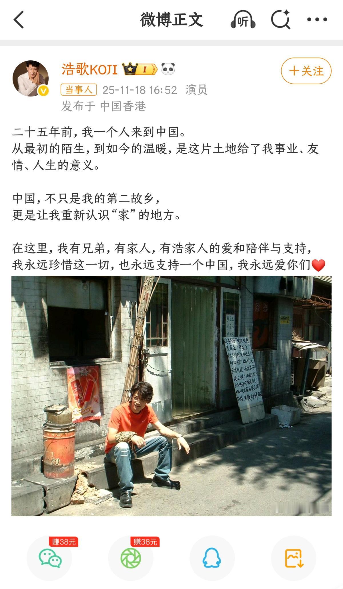 矢野浩二发文说:中国,不只是我的第二故乡,更是让我重新认识“家”的地方。看得出来,文字里是满满的真诚感。 最初认识他是天天向上,现在仍然记得他那句:“开心开心极了”,作为演员,他从来不回避历史,抗战剧里经常看到他的身影,形象无疑都是鬼子。 据说他的妻子是中国人,孩子入的也是中国籍,在日本即使被当地黑帮打和威胁也阻止不了他爱中国。还在节目中下跪高喊“我爱中国”。 我感觉他对中国,没有刻意讨好,是发自内心的认同,给予了事业发展的地方,人总会对这个地方抱以善意与情感。