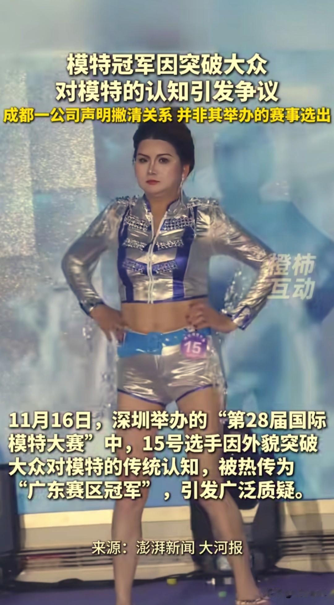 11月16日在深圳举办的第28届模特大赛广东冠军15号选手因突破大众对模特的认知引发热议。 主办方回应:联合主办方仅仅掏钱赞助赛事,跟我们没有任何关系,具体由负责人邓某解释。 成都某公司声明撇清关系,称“15号模特冠军”并非其举办赛事选出,“不要伤及无辜,每个赛事都有自己的评选标准”。 来源:澎湃新闻 因和2025国际模特超模大赛网友们混淆,组委会也做了辟谣,组委会工作人员回应,广东赛区15不是冠军,冠军是艾玛尔。 网友们混淆的是在另外一项第28届模特大赛广东赛区的比赛中,有一位15号选手夺冠,这位选手因其成熟的风格和舞台魅力受到了关注。 这位选手获奖被认为展现了审美标准的多元化,证明了模特圈并非年轻人专属,成熟的从容与底气同样具有独特的魅力。 模特颁奖典礼 深圳女模特 广东模特走秀 模特总冠军 模特评选