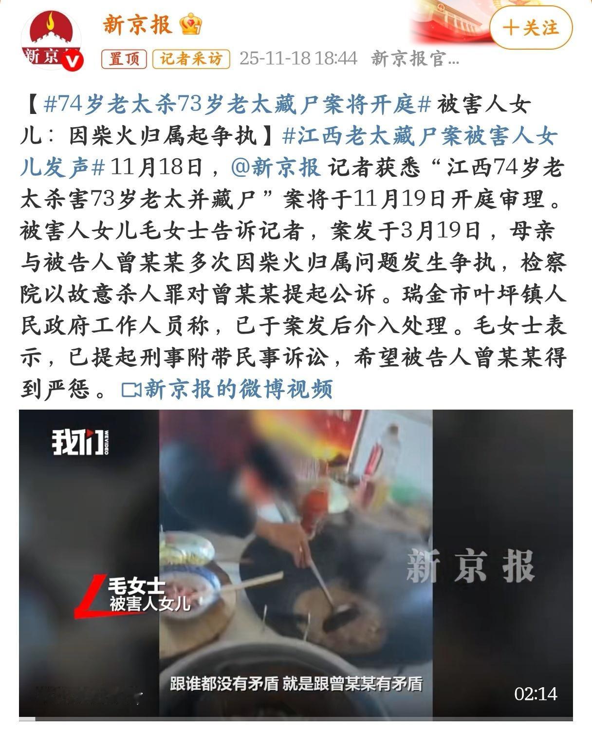 恶魔在身边,因为一捆柴火74岁老太杀73岁老太藏尸,杀完人之后还淡定串门。 在走路都费劲的年纪,江西省瑞金市叶坪镇,曾某某和被害人长期因柴火归属权争执,案发时曾某某将被害人按倒在地,用石头猛击太阳穴十余次致死。 过几天即将开庭了,可按法律依据,曾某某作案时74岁,未满75周岁,不适用《刑法》第十七条"75岁以上可从轻减轻处罚"的规定,若判决时年满75岁,原则上不适用死刑,但"以特别残忍手段致人死亡"除外。 我一直以为上了年纪的老人都很温和、慈祥,现在倒是让我改观了,只想说坏人变老了还是坏人,年龄与人性善恶无关 。