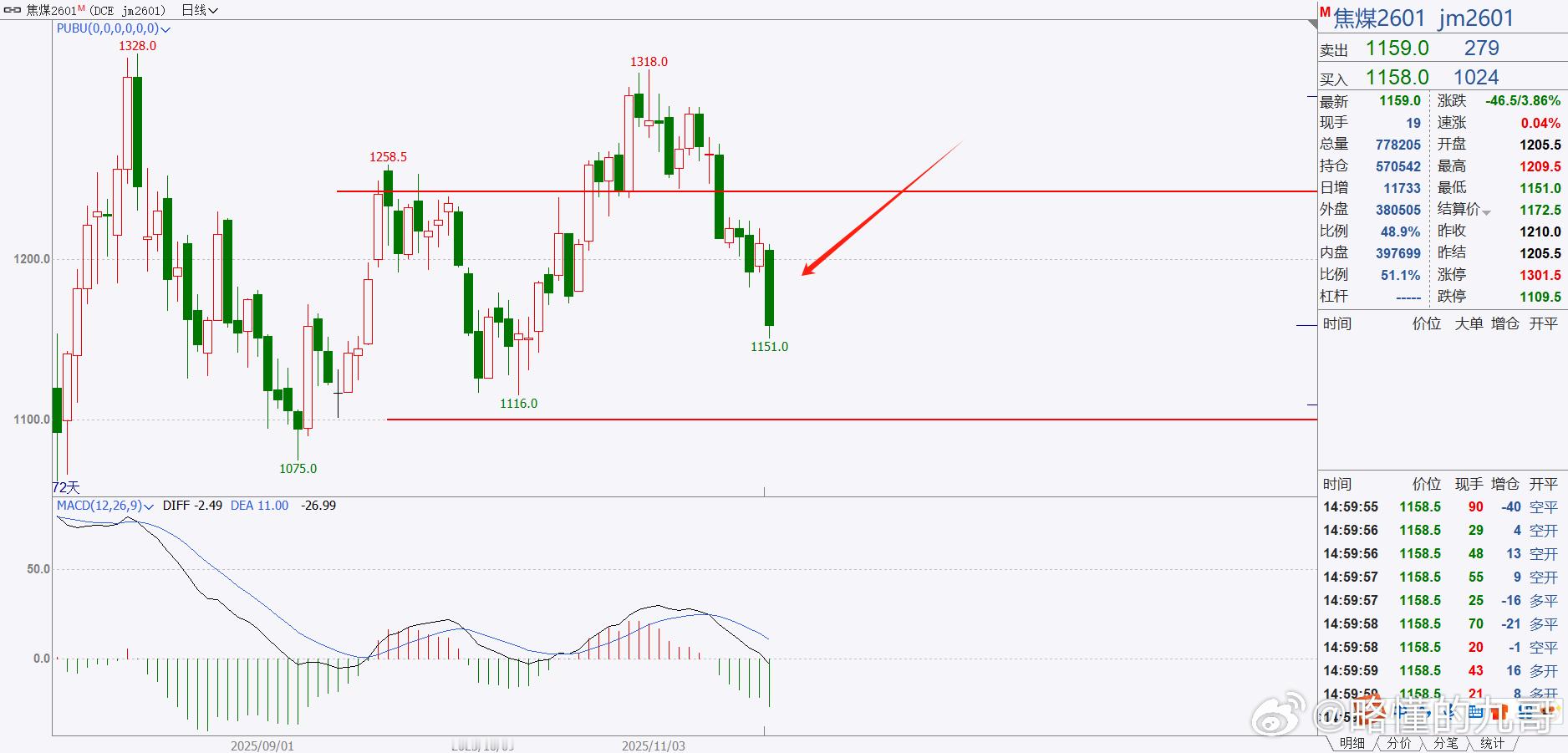 焦煤继续维持之前的观点,今天收大阴线,继续有概率到1100