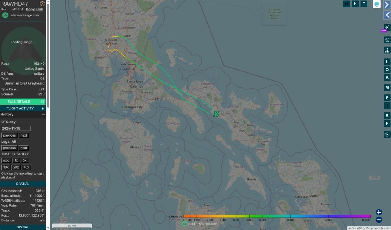 尼米兹号已抵达西太——AIS信号显示,11月18号,美国海军尼米兹号(CVN-68)航母打击群已经通过圣贝纳迪诺海峡进入西太平洋。比较罕见的是,在尼米兹号抵达西太平洋之后,其舰上的C-2A“灰狗”舰载运输机再次飞往了菲律宾克拉克空军基地。➤不会又发生了什么紧急情况吧