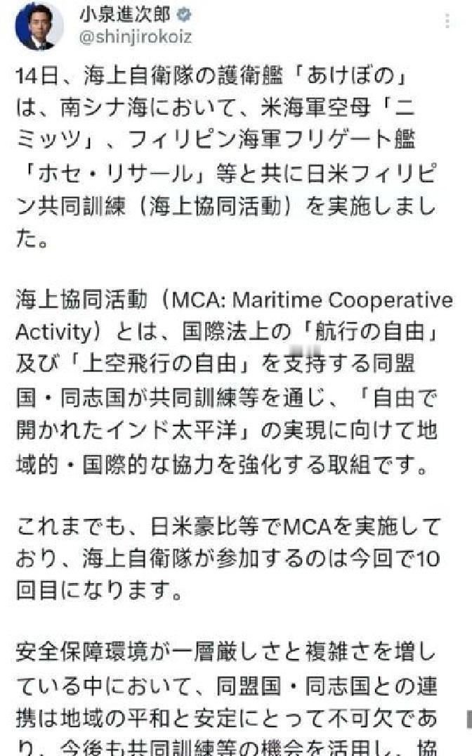 快讯!快讯! 日本防卫部门突然宣布了。 据读卖新闻11月18日报道,14日日本海上自卫队“曙”号驱逐舰与美军“尼米兹”号航母、菲律宾护卫舰在南海开展联合演习,日方称是践行所谓“自由开放印太”,并强调维护航行与飞越。这一步明显在提高三方在该海域的到场频率和曝光度。 紧接着的动向也很清楚。据公开信息,中国南部战区组织轰炸机编队在相关海域巡航,配合海上力量开展处置行动,用可见的空中力量回应外军舰机活动,表明态度和底线。 从具体兵力看,“曙”号是村雨级通用驱逐舰,配备一门127毫米舰炮、舰空与舰对舰武器,并带一架SH-60反潜直升机,常见任务是护航、对海对潜。与航母编队协同,重点多在通信、联动与编队机动。对照中方,南海方向海空兵力常态化值班,舰机联合巡航频率稳定,海上跟监与空中警戒衔接紧密。 把时间线拉到今年,多次美日菲合练已覆盖联合搜救、反潜与跨军种协同等科目,节奏在提速。问题在于,三方在周边可依赖的补给点有限,连续停留受约束。对比之下,永暑、美济、渚碧等岛礁具备飞行与后勤保障能力,岸基支撑让区域存在更稳定。 落到打击半径,中方H-6系列具备对海突击能力,可与侦察、指挥、引导力量配合,形成较远距离拦阻。相对而言,驱逐舰与护卫舰需要依托舰载机与预警平台支撑外层警戒,否则警戒圈容易被压缩,行动余地受限。 再看信息与预警,美国航母有完善的空中预警与巡逻体系,反应速度快、流程熟。中方近年在预警、通信与指挥一体化上密集演练,南部战区多次组织海空联合警巡,目标就是把发现、判定、处置的链条跑顺。 回到日本角色,日本不是南海声索方,却频繁进入相关海域参加演练,公开理由是航行与飞越。此举会增加现场交互的复杂度,海上通联、距离管控和科目设计都得更稳,稍有不慎就会放大摩擦。 看向菲律宾,与日本在今年7月签署部队互访协定已公开。随之推进的,往往是训练、情报与港口使用等安排。强度提高的同时,控险能力必须同步升级,否则成本会快速上升。 现场处置上,这类合练常伴随侦察与抵近活动。中方的常规做法是无线电警告、海空跟监、依法处置,并在必要时开展区域演训,既回应又把握节奏,避免误判扩散。 东海与南海的连带效应也在显现。日本若在两个方向同时加码,就要面临海空兵力分配与补给的现实压力。中方能够保持两向高频巡航和海上执法,说明调度、后勤与训练体系已形成规模化能力。 从结果看,话语可以多种多样,但舰机的到场时长、科目强度和行动轨迹最能说明问题。谁能长期、稳定在场,态度就一目了然。 南海需要的是可预期的节奏和清晰的规则。减少刺激性动作、保持必要沟通,风险可控,秩序才能稳住。