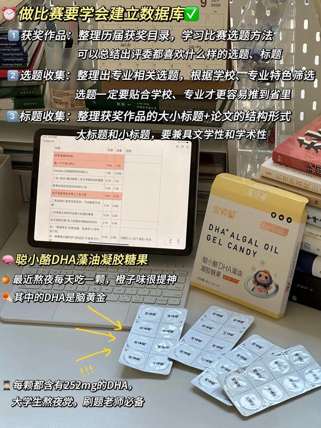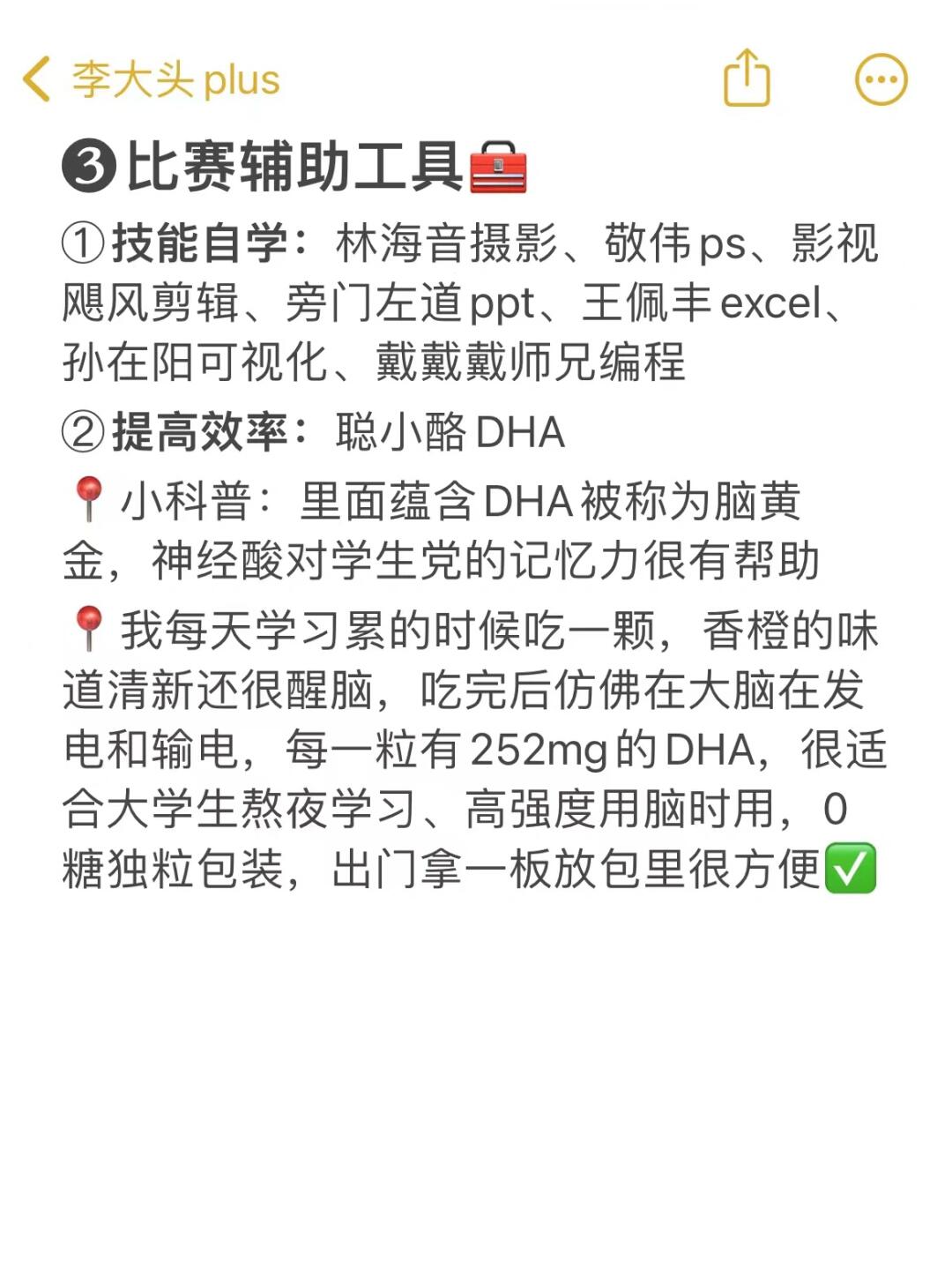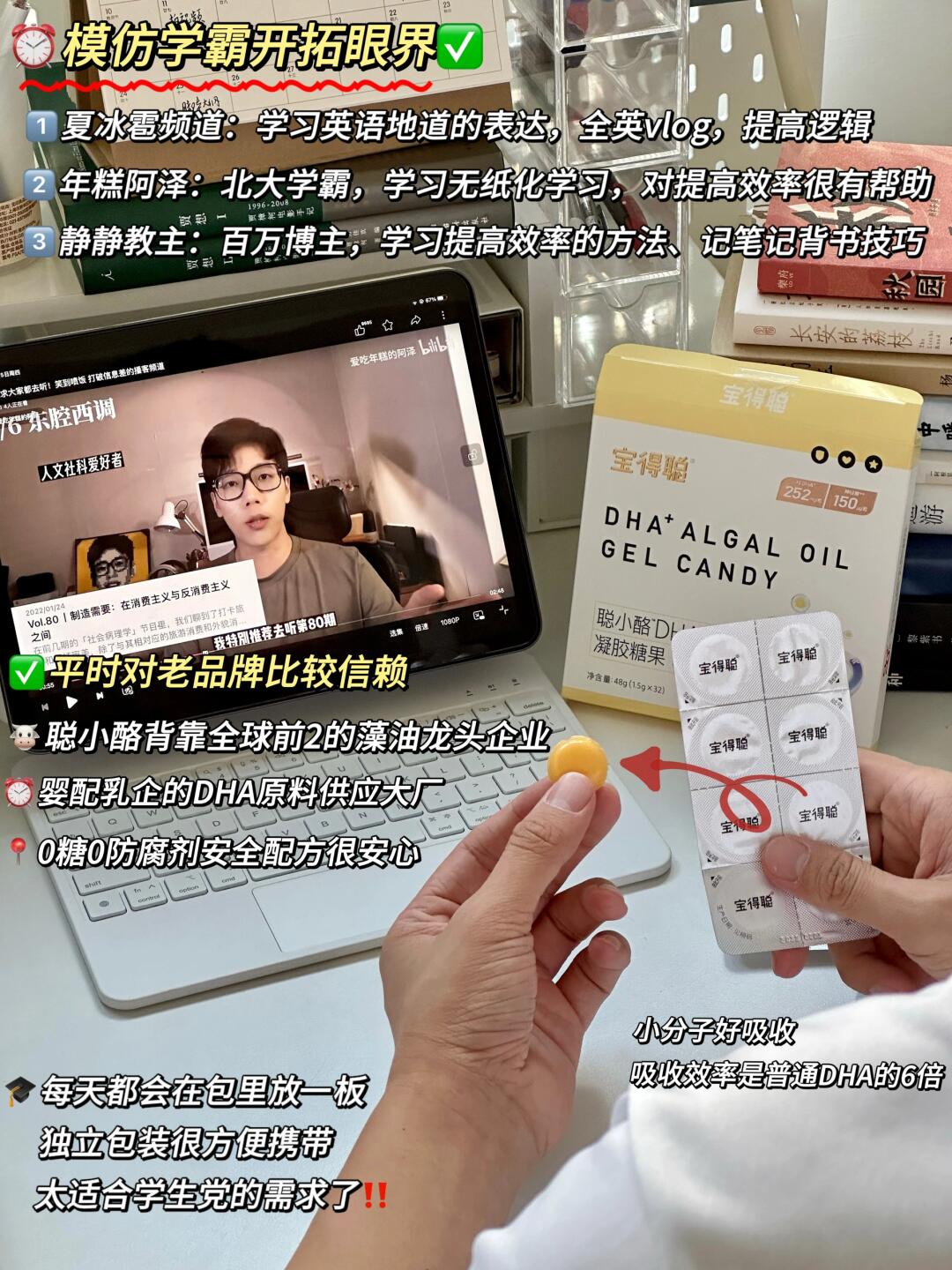 DHA是重要的多不饱和脂肪酸,被称为脑黄金,人体没法自身合成dha,补充dha很重要。做了些功课,选了咱们国货大品牌,润科宝得聪的聪小酪dha藻油。润科是国内八九成宝宝奶粉DHA原料供应商,这种大品牌出品吃着更安心。学习累了吃一颗,没有腥味,香橙味清新醒脑。每粒252mg的DHA,48%高纯度还添加神经酸,适合学生党熬夜学习、高强度用脑。还通过老爸评测抽检,0糖配方,无防腐剂重金属很放心。独粒包装出门放包里很方便