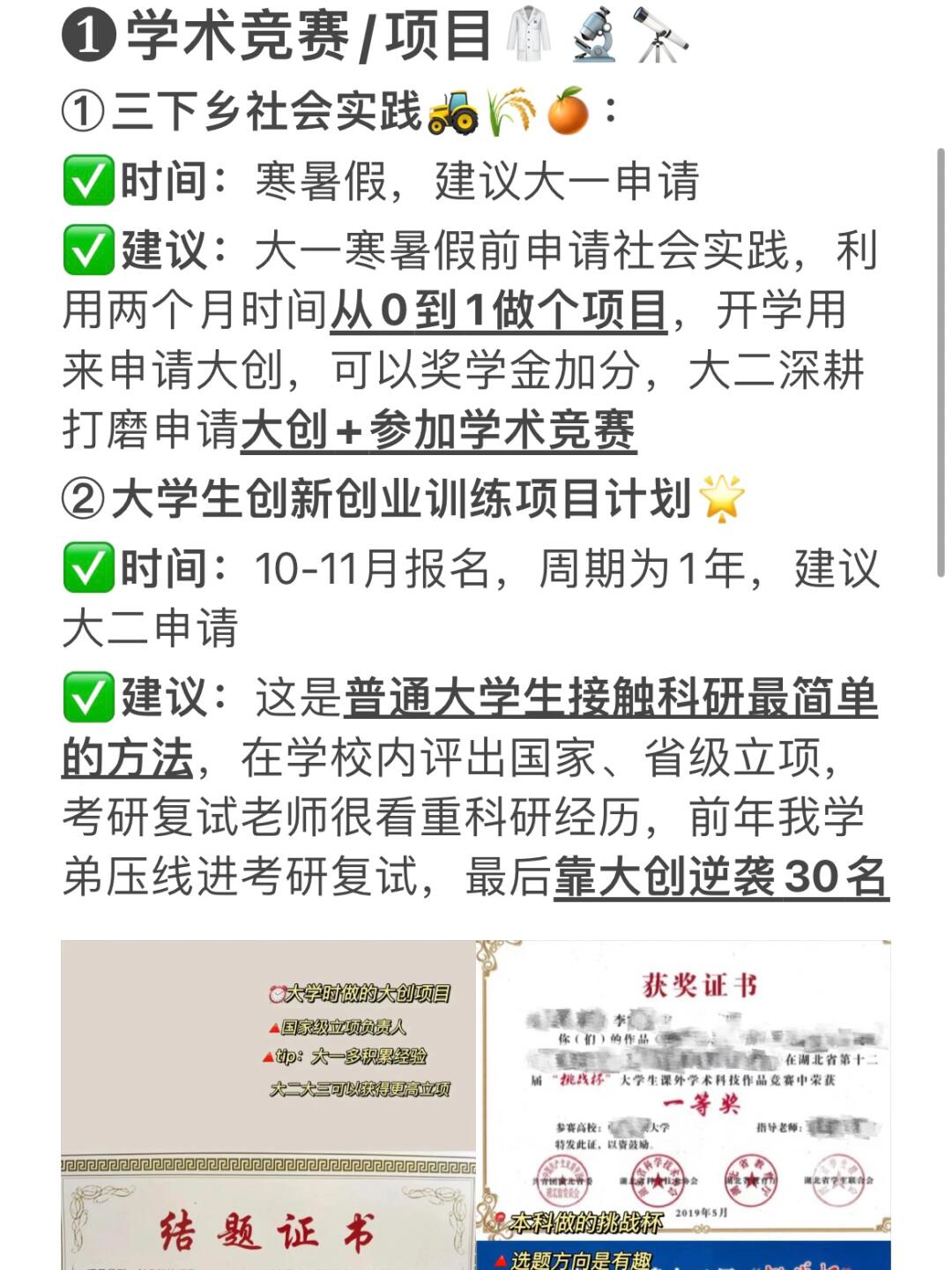 🔻建议:大一寒暑假前申请社会实践,利用两个月时间从0到1做项目,开学申请大创,能奖学金加分,大二打磨申请大创+学术竞赛