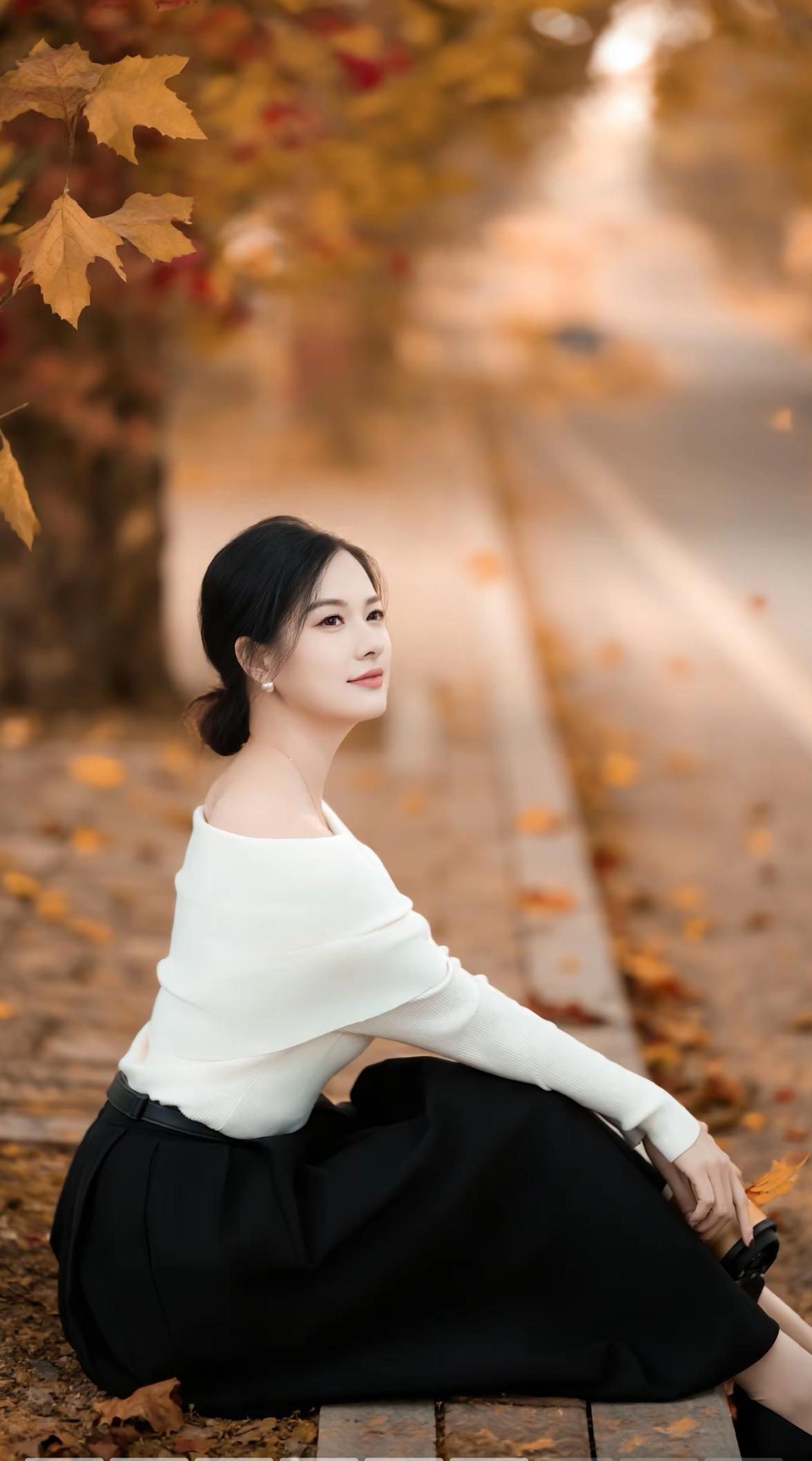 秋日暖阳下,优雅黑裙与白衣相映,静谧美好。