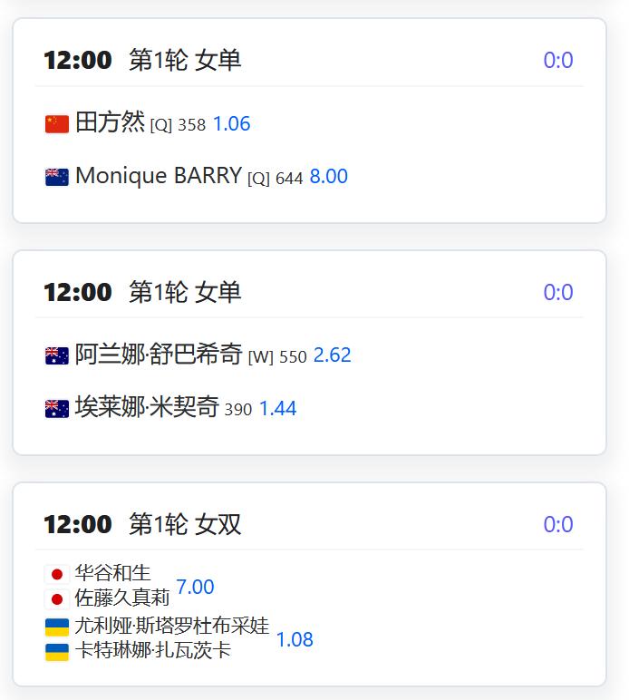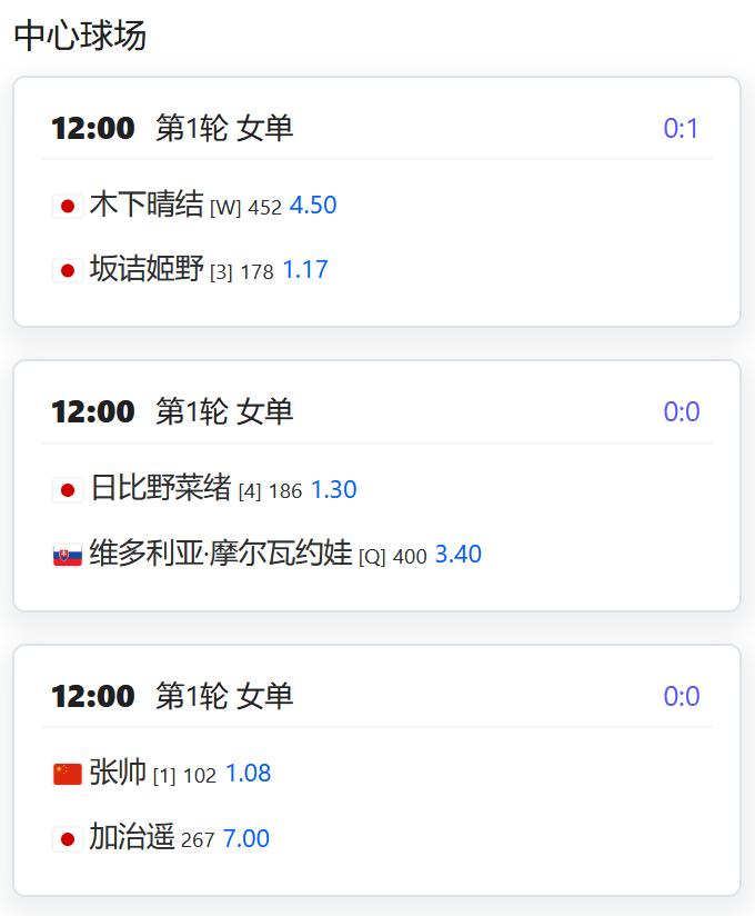 W100高崎,鲁晶晶、李宗钰均止步资格赛。 正赛第一轮,头号种子张帅将在首轮对阵加治遥; W75悉尼,8号种子韦思佳6-2,6-3击败韩国资格赛球员,晋级第二轮; 从资格赛突围的田方然将在首轮对阵同样从资格赛突围的新西兰球员柏丽。