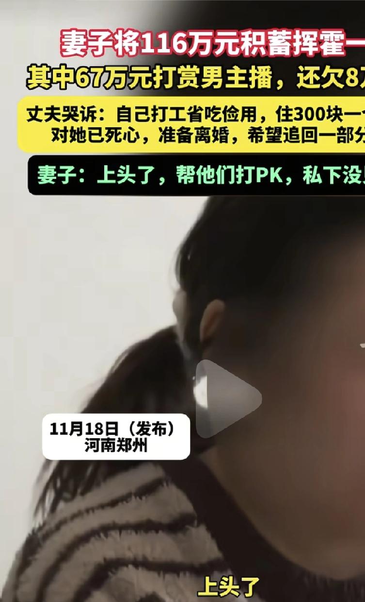 河南郑州一男子哭诉结婚八年,妻子花光百万家产。男子平时在外打工时候舍不得吃舍不得穿,住300一个月的房。而妻子在家里,住着房子吃着好吃的,开着地暖,看着直播,却把两人的116万存款花光,其中67万被拿来打赏主播,还欠了8万网贷,卡里剩下0.3元。剩余款项去向不明。男子说我那么相信她,而她却把钱全部挥霍完。妻子说我看他们打pk,我就上头了,也不知道怎么了 ,私下也没有见过面。丈夫说我省吃俭用给她钱,她却把钱给了别的男人。男子一边哭 一边说,不爱了,再也不爱了,心灰意冷,被妻子背刺。 现在直播机制pk格式各样,容易刺激粉丝攀比打赏,相关家庭纠纷频频发生,网友们一定要擦亮眼睛,不要被糖衣炮弹给俘获。今日热推 一人一条信息差 网络 直播