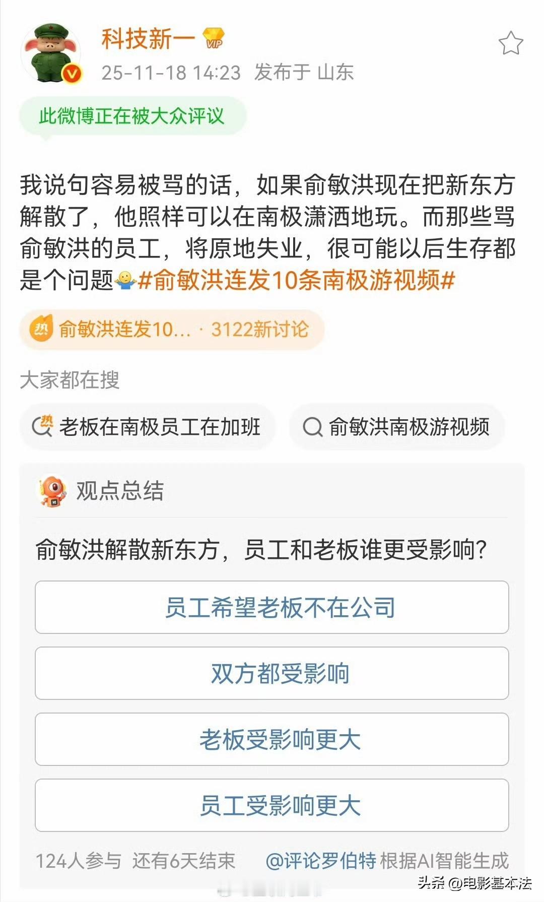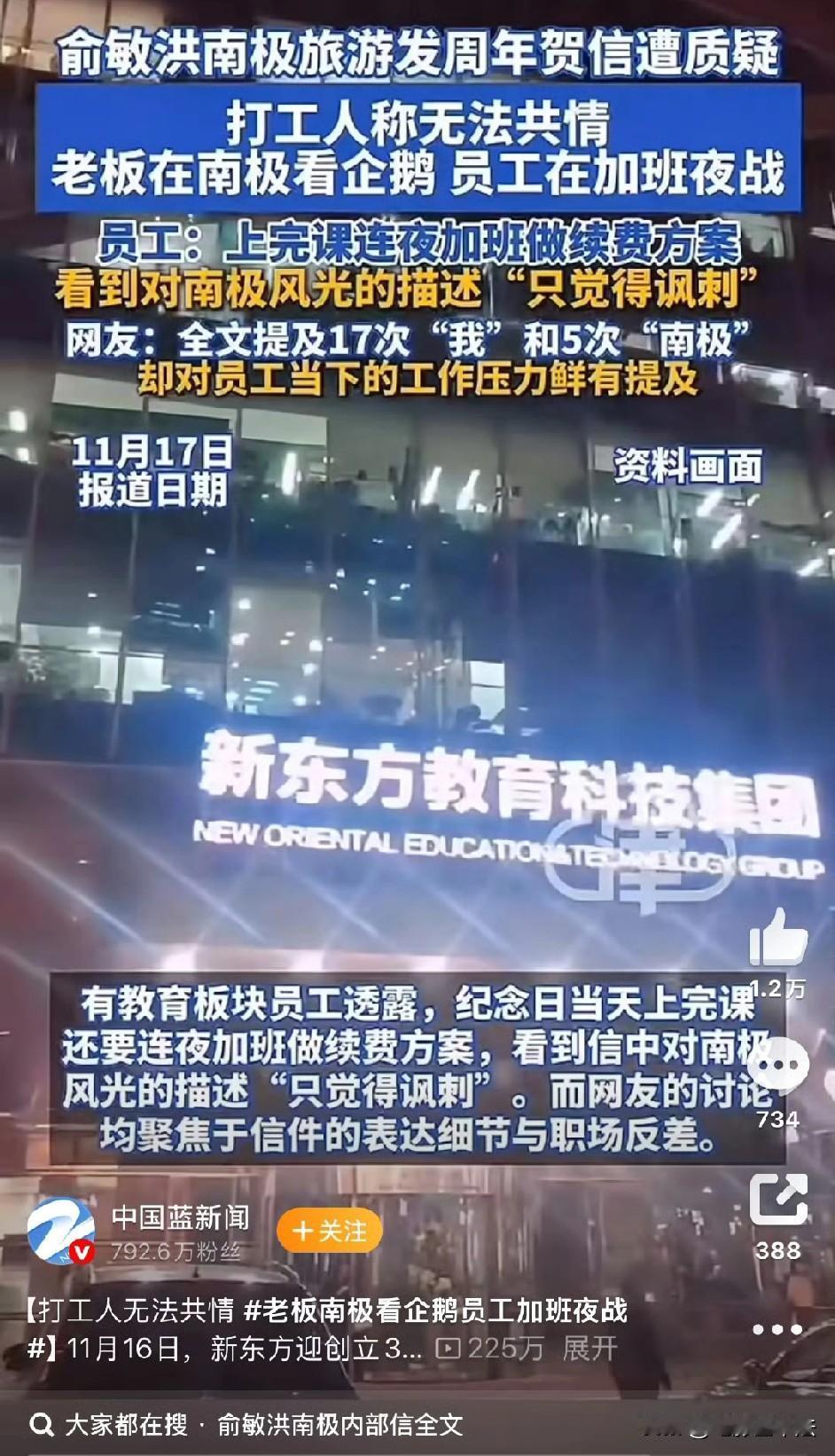 通过俞敏洪被员工吐槽这事,看得出俞敏洪确实是中国难得的好老板,是个有担当的企业家。 第一,员工可以吐槽他工作不受影响,这说明他是个大度的人,婚国内有几个大企业的员工敢公开吐槽老板的?这说明新东方的企业文化是开明的,是包容的。 第二,新东方的福利待遇是高于行业平均水平的,从不欠薪,各项福利待遇该有的都有。更厉害的是,账上的现金储备足够保证企业突然解散时员工的收入和遣散费不会受影响,国内多少企业能做到这点? 个人觉得吐槽俞敏洪的这位新东方员工有点狭隘了,老板只要工资发到位,你管他去哪里旅游呢,你可以不喜欢但是公开吐槽很不礼貌,这就是企业家与员工格局上的差距。 俞敏洪去哪里旅游都很正常,不论是公开发文又或发企业内部公开信都是他的权利,因此破防的网友,大概率是见不得别人的日子比他过得好,如果这种症状特别明显,那需要及时治疗,否则可能影响一生。