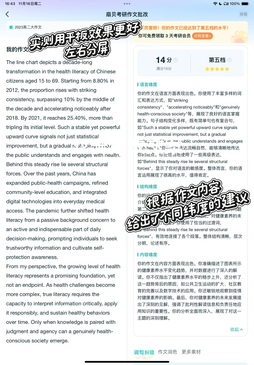 - [反馈内容全面:语法纠错、语言润色、结构点评、素材补充