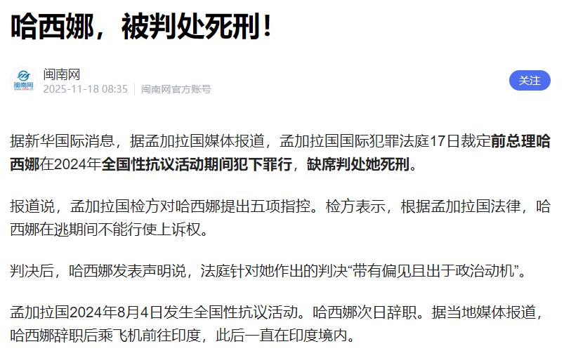 孟加拉终于有了底气!亲印前总理,哈西娜被判绞刑! 1971年印度出兵干预后,孟加拉国虽实现名义上的国家独立,却长期陷入经济依附的泥潭,成为印度在南亚地缘棋盘上的"棋子"。这种依附性的深度,光看贸易逆差就一目了然。 孟印两国常年维持着120亿美元的不平衡,孟加拉国支柱产业纺织业所需的棉花,几乎全靠从印度进口,连基本民生商品供应都被攥在邻国手里。 印度凭借这种经济控制力,动辄以关税壁垒和能源供应为筹码,干涉孟加拉国政局。前总理哈西娜执政时期的亲印政策,更是让这种依附关系达到顶峰,当时外界甚至调侃孟加拉国是"印度的后花园"。而转折点,出现在中国援建项目的落地生根。 今年3月通车的达卡绕城高速公路,全长48公里、总投资4.12亿美元的孟加拉国首条全封闭高速公路,不仅缓解了首都常年拥堵的交通乱象,更关键的是串联起北部和东北部工业区,让孟加拉国终于有了不经过印度领土的内部物流大动脉。 紧接着,中国承诺投资4亿美元改造的蒙格拉港,升级后集装箱吞吐量将跃升至每年150万标箱,这意味着孟加拉国进出口货物不必再绕行印度加尔各答港,物流成本直接降低30%以上。这些基建项目就像一把把钥匙,打开了孟加拉国经济自主的大门。 经济结构的变化更具说服力,今年第一季度,中国对孟加拉国直接投资额达到1.135亿美元,这个数字超过了2024年全年投资的一半,上半年同比增幅更是高达47%。 在制造业领域,中国企业与孟加拉纺织厂合作扩建生产线,借着美国对印度加征25%关税、对孟加拉仅收20%的契机,抢下大量原本流向印度的服装订单。 更重要的是,中孟还启动了自贸协定谈判,中国承诺将零关税待遇延长至2028年,这让孟加拉国在摆脱印度市场依赖的同时,找到了更广阔的出口通道。 现在中国已连续15年成为孟加拉国第一大贸易伙伴,近千家中国企业在孟经营,从成衣制造到绿色能源,全方位重塑着孟加拉国的经济格局。既然经济腰杆硬了,那么政治上自然也就有了底气。 11月17日,孟加拉国法院对哈西娜判处死刑并向印度提出引渡请求,这在几年前是不可想象的事情。要知道,哈西娜执政时,印度对孟加拉国政局的影响力渗透到各个角落,任何针对亲印势力的动作都可能引发印度的强烈反弹。 但如今,随着提斯塔河综合治理项目重启谈判,中国将提供5.5亿美元贷款帮助解决水患问题,吉大港经济产业园区也在加紧建设,这些项目不仅创造了大量就业岗位,更让孟加拉国民众看到了摆脱依附的希望。 过去被压制的反印情绪,自然从政治领域蔓延到经济层面爆发,民众自发抵制印度制造,连印度一直引以为傲的"邻里第一"政策在孟加拉国都成了笑话。 当一个国家不再需要看邻居脸色过日子时,自然有勇气清算过去的政治账,印度这次就算想插手,也发现自己手里的筹码已经没那么管用了。
