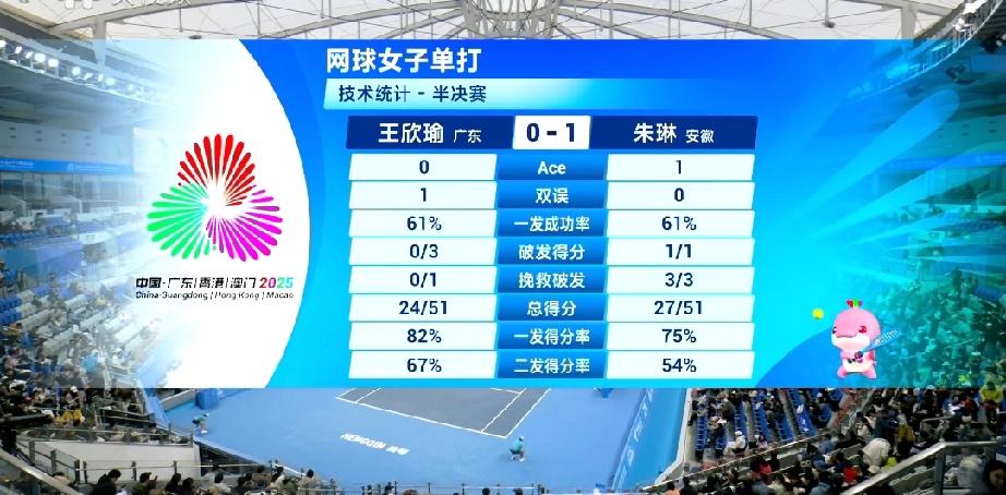 王欣瑜3:6丢掉第一盘,晋级决赛的希望越来越渺茫了! 从赛后的统计来看,王欣瑜无论是一发得分率还是二发得分率都要高出朱琳不少,可最终的结果却是她输掉了第一盘。主要还是她第一局没有快速进入状态,让朱琳逮到了唯一的一次破发机会,而自己拿到的连续三个破发点,又没有很好的把握住,这是她输掉第一盘的两个原因。 希望王欣瑜第二盘能扳回比分,最终逆转比赛!