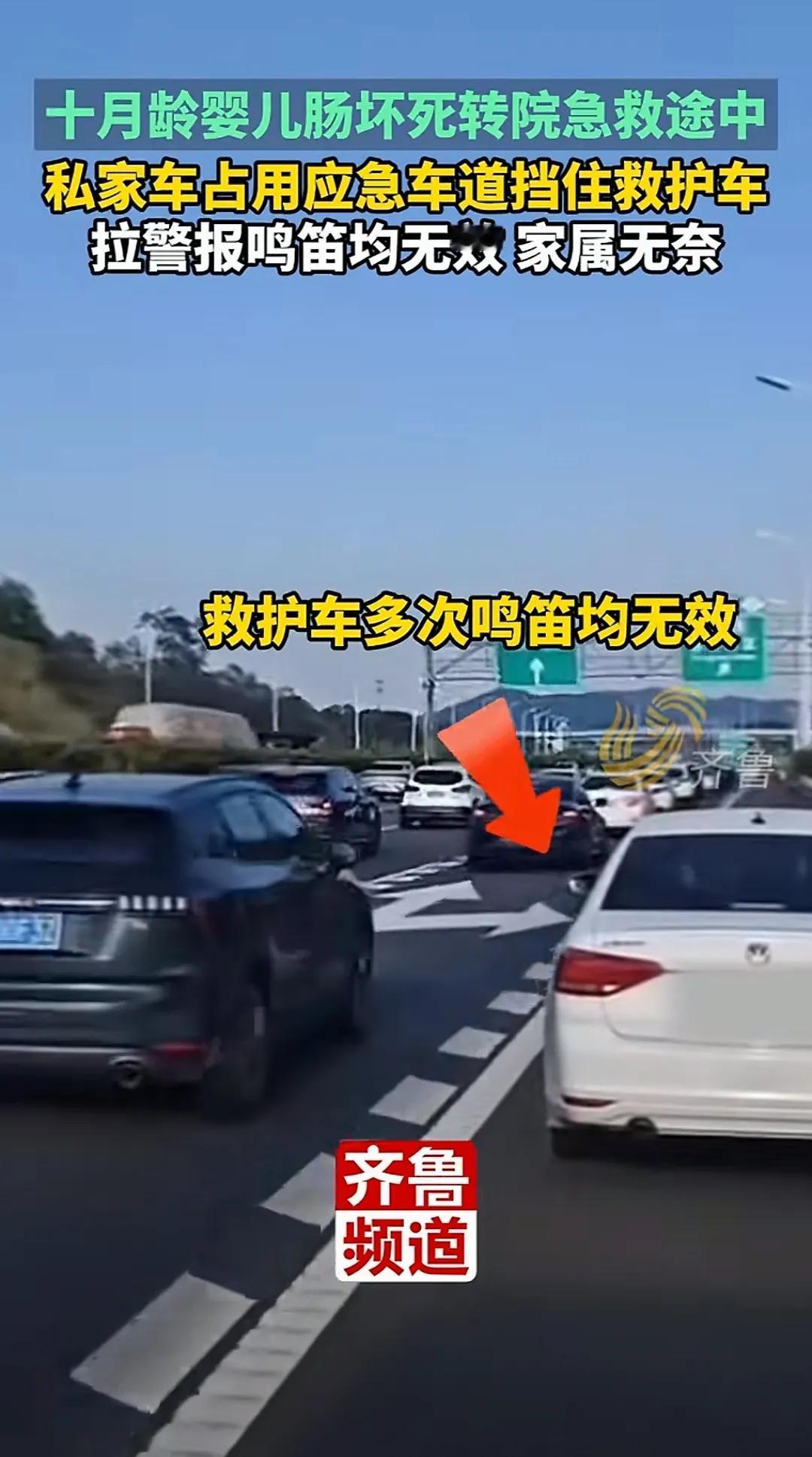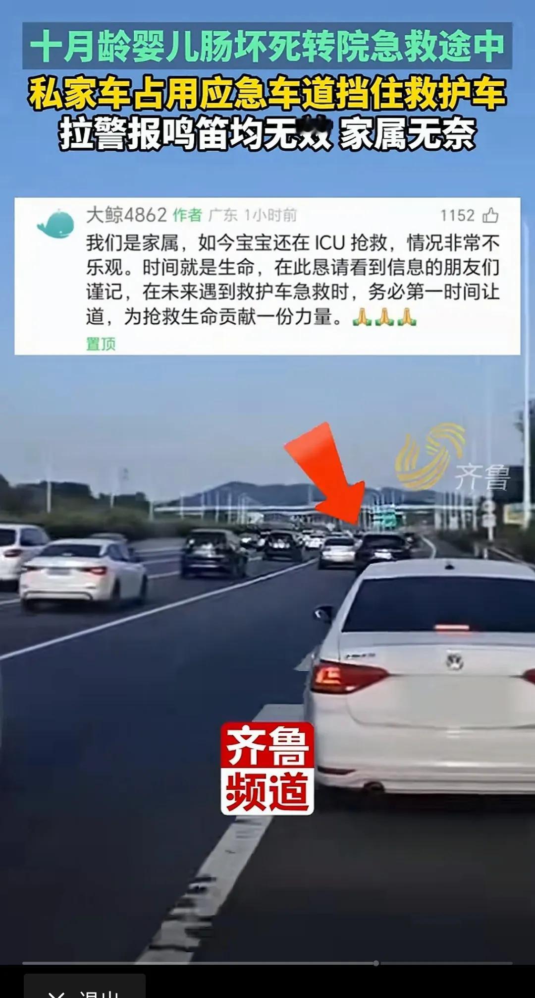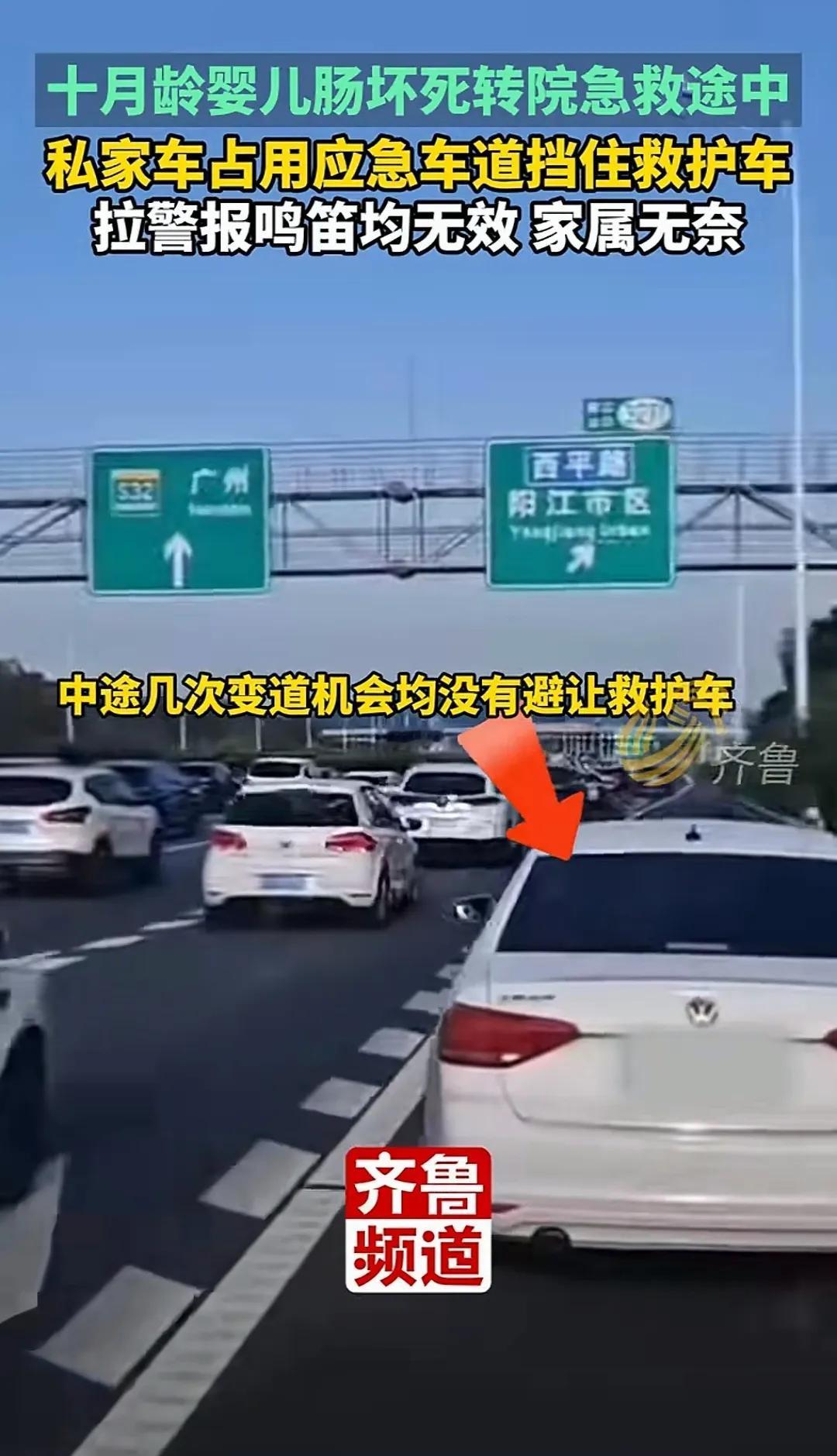 可恨!10月4日报道广东一10月龄婴儿肠坏死,急需转院到广州进行急救,已开腹,救护车争分夺秒抢时间争取尽快救治,但令人无语的是,救护车行驶途中,竟遇到一白色私家车挡道![黑线] 一名十月大的婴儿因肠坏死接受开腹手术后,需紧急从当地转至广州救治,转运途中,救护车在高速上鸣笛疾驰,却遇一辆白色私家车长时间占用应急车道,未予避让。 该车司机因占用应急车道且未避让执行紧急任务的特种车辆,被处以罚款300元、记9分,而婴儿目前仍在ICU抢救,情况危重,不少人在关注事件进展的同时,也再度聚焦于“生命通道”被占这一老问题。 为救护车,消防车等紧急车辆让行,不仅是法律的明确规定,也是驾驶者应有的文明意识,那声声警笛的背后,可能是待抢救的生命,也可能是一个家庭的希望。 如因此产生交通违法记录,车主可申请复核撤销,此外,“45度让路法”也是一种有效方式即左右车道车辆同时向两侧斜向避让,为后方紧急车辆腾出通道。 每一次及时,规范的让行,都是在为救援争取时间,养成良好的让行意识与掌握正确的让行方法同样重要,这不仅关乎个人驾驶素养,更关乎整座城市的应急效率与生命关怀。 生命可贵,为抢救生命贡献一份力量,不做挡道的坏人。 “这种占着应急车道还不让的人,就是马路上的‘巨婴’,根本不懂‘责任’两个字怎么写,罚9分都算轻了,应该直接吊销驾照,让他回炉重造。” “看到那个宝宝才10个月大,我心都揪起来了,我自己也有孩子,将心比心,孩子爸妈在车上该有多绝望啊,挡道的司机,你一辈子都不会心安吗。” “给大家科普一下,‘45度让路法’真的靠谱,但关键是要冷静,在保证自己安全的前提下,给救护车让出生命通道,即使不小心闯了红灯或压了线,收到罚单后是可以申请复核撤销的,交管部门会调取监控核实,大家不必有这个顾虑。” “在高速上,听到警笛声,第一反应是减速,观察后视镜,判断特种车辆来的方向,能靠左就靠左,能靠右就靠右,空出中间车道。最忌讳的就是突然刹车或者不知所措,平时多了解这些知识,关键时刻才能不掉链子。” 在今天这样信息发达的时代,礼让救护车的基本道理人人都懂,但为何类似“马路巨婴”挡道的事件仍会一再上演? 信源:潇湘晨报