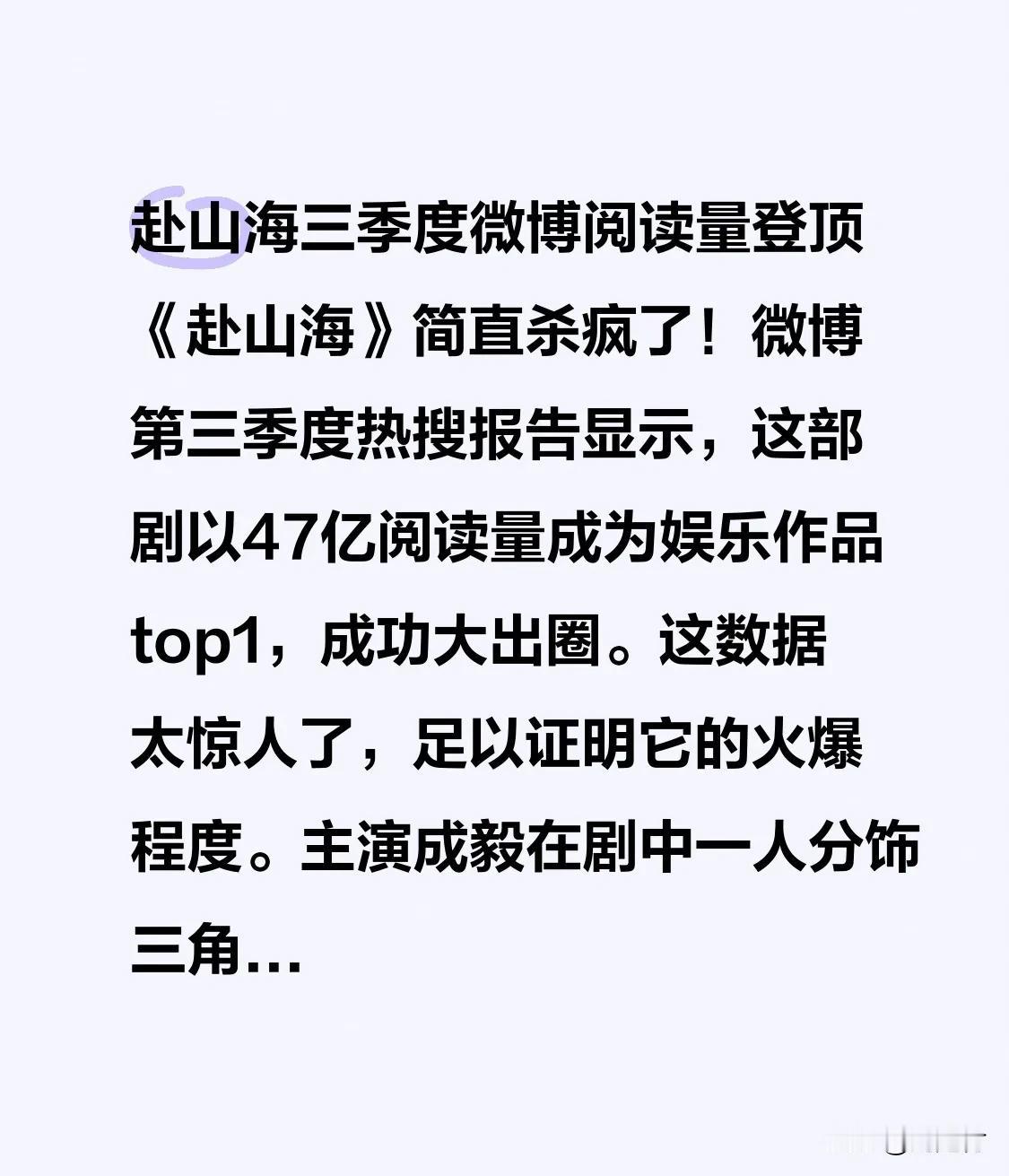 赴山海三季度微博阅读量登顶《赴山海》三季度微博阅读量登顶,“杀疯了”!微博第三