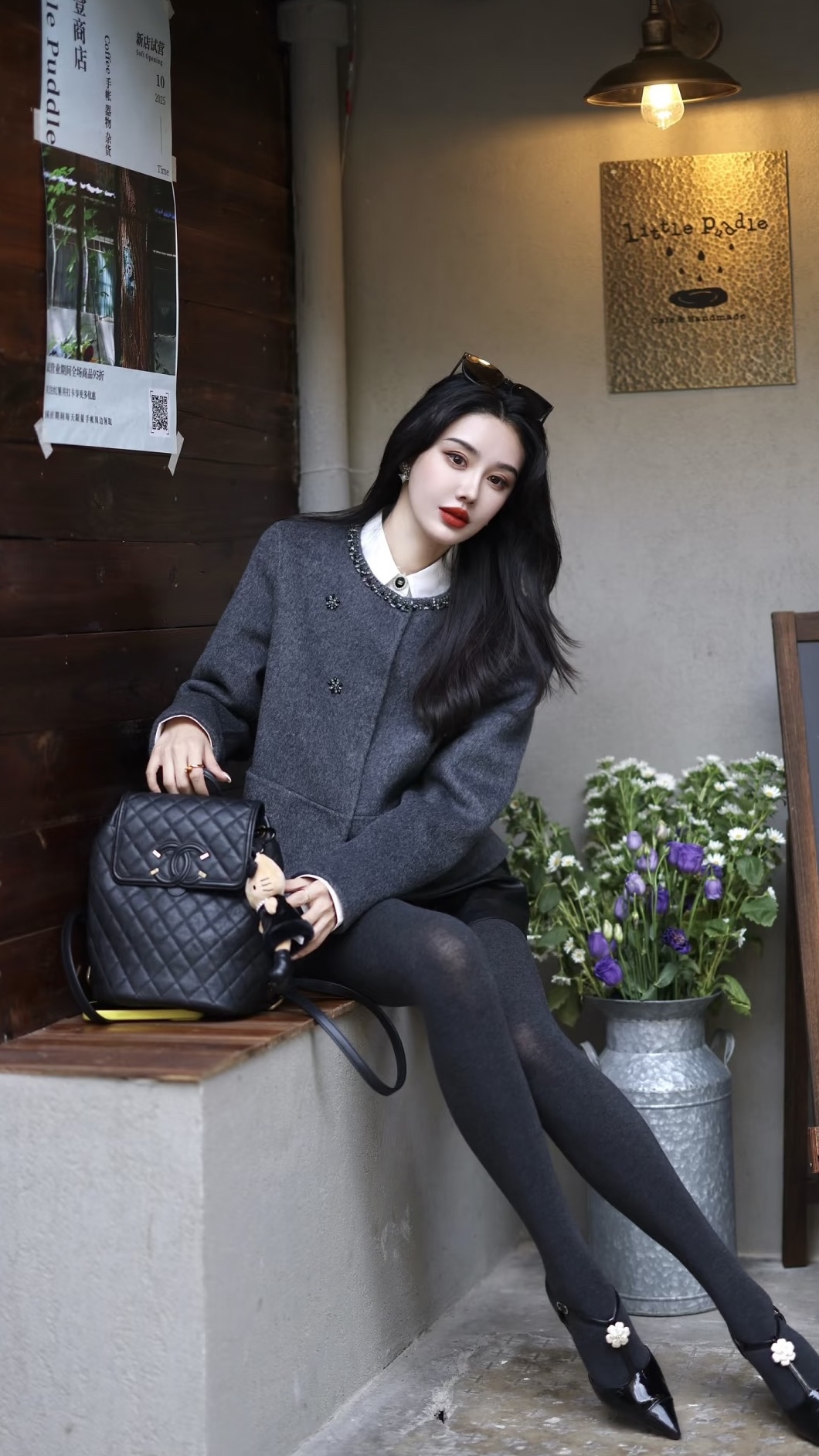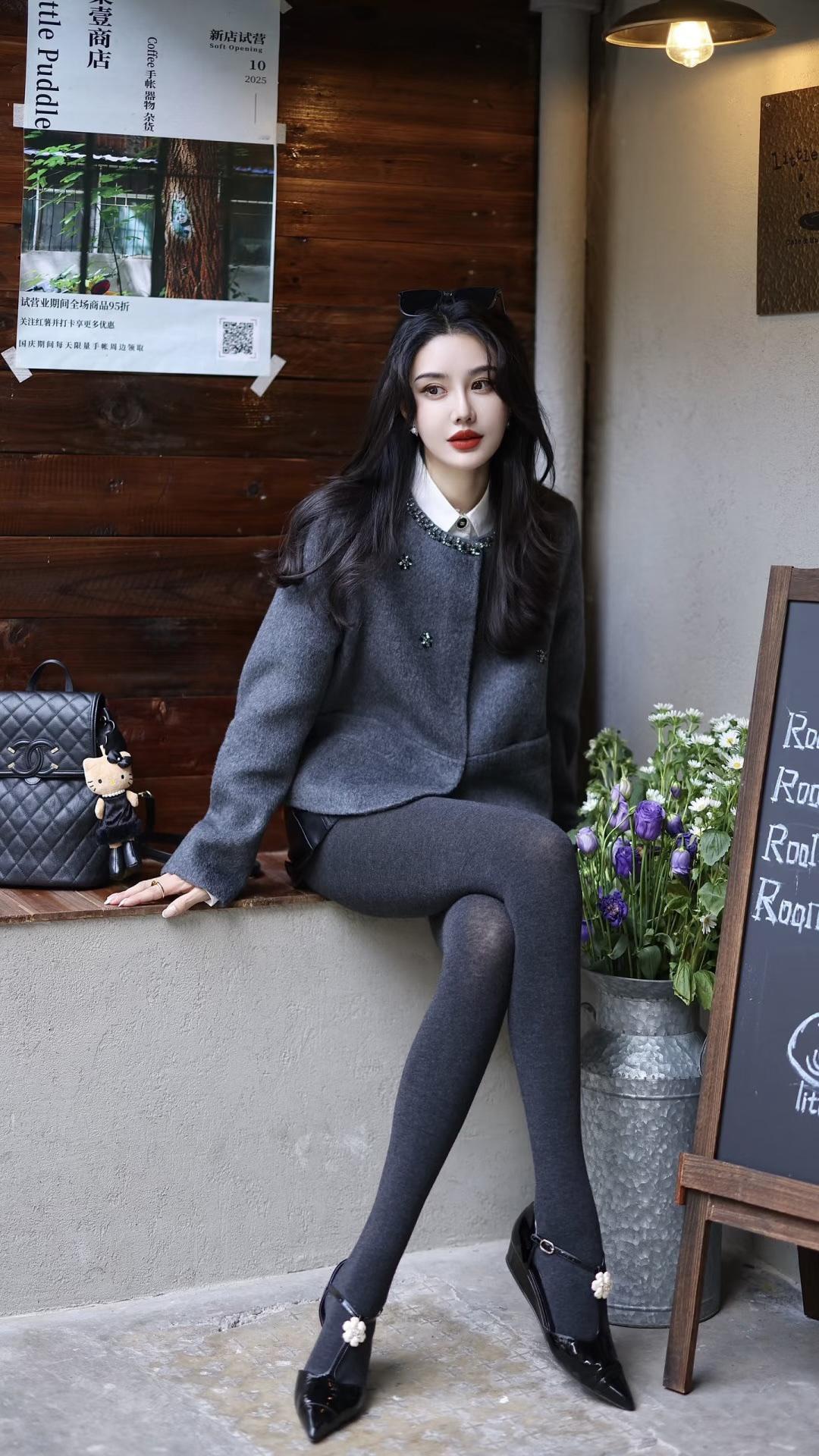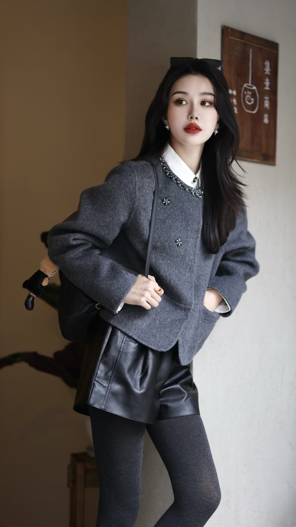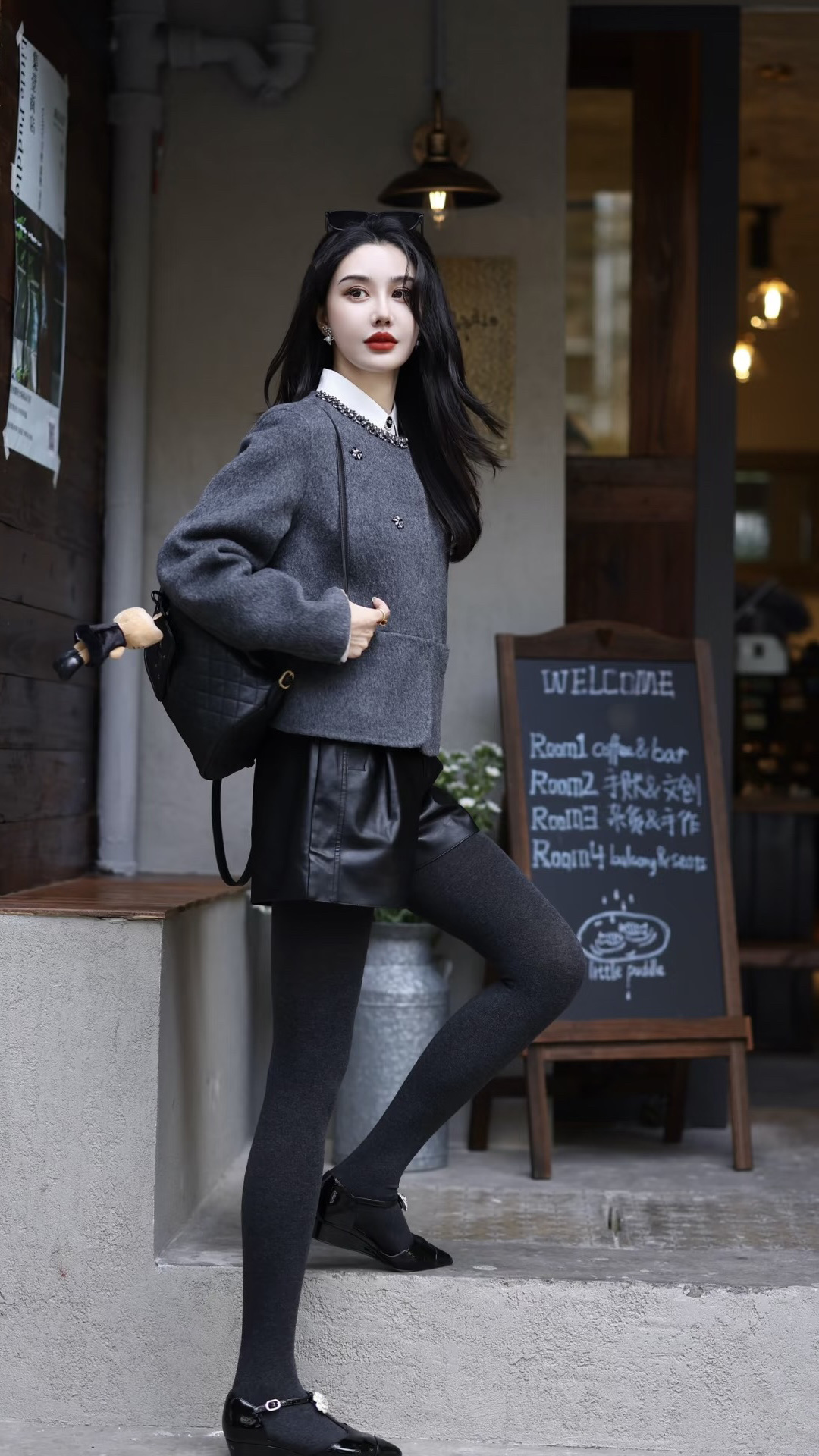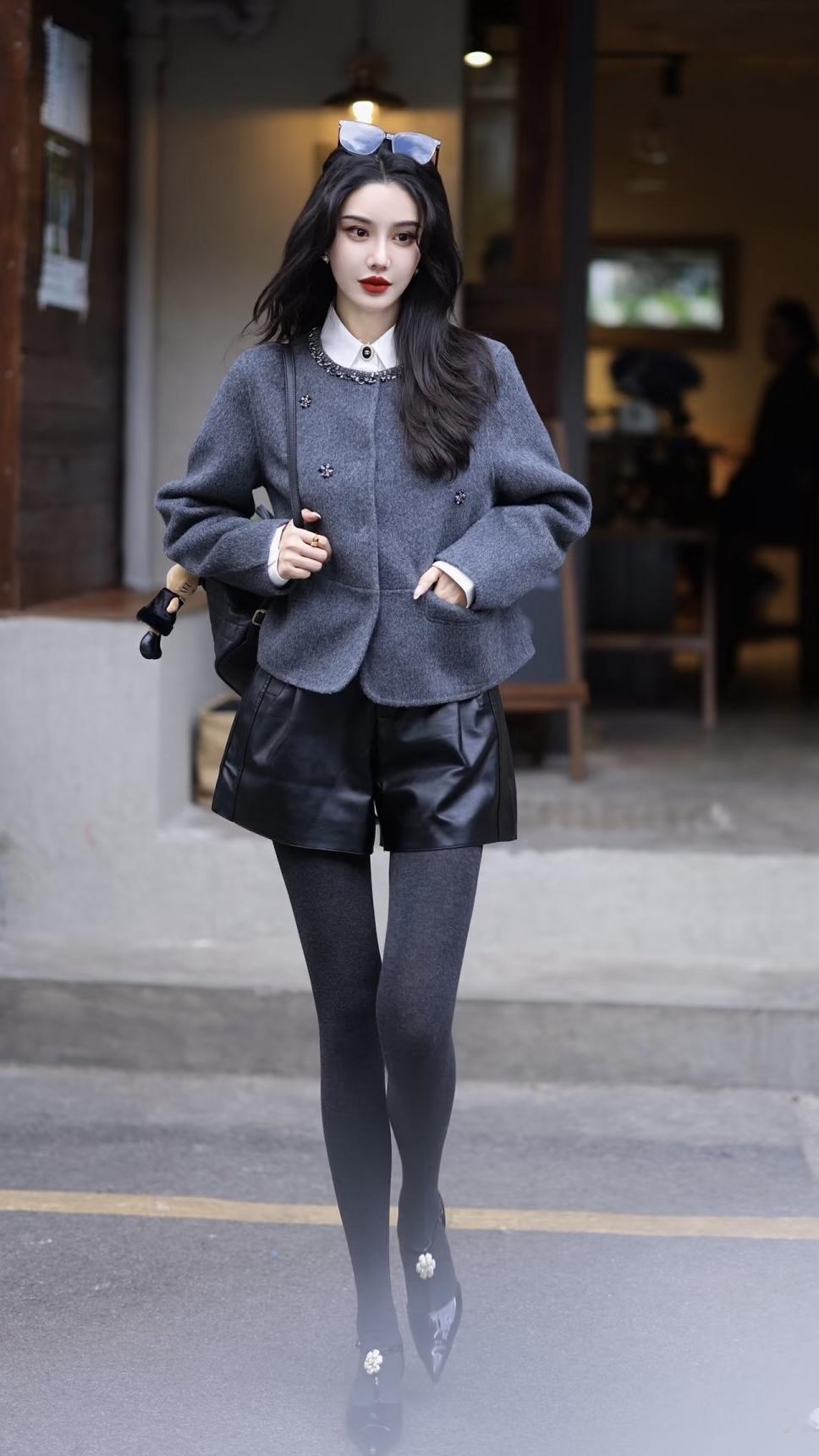 颜值穿搭|灰色小香风外套搭配皮质短裤,精致中带着随性。灰色羊绒袜,既保暖又显高级感。平底尖头鞋与珍珠装饰,为整体增添一丝贵气。小香风的优雅与秋季的慵懒完美融合,简洁大方,无论是日常出街还是约会,都能轻松驾驭。氛围感出片穿搭外套小香风穿搭 小香风灰色套装 街拍.美女.穿搭.大长腿 高冷御姐 时尚美女大长腿 秋季穿搭