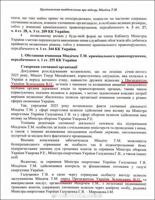 开始为乌克兰失败找替罪羊了,小泽未来堪忧啊……到时候就是乌克兰输了跟西方各国都没关系,都怪小泽和身边亲信的腐败无能导致的…… 泽连斯基在对明迪奇提出的腐败指控中被提及▪️文中称,明迪奇利用与泽连斯基的友好关系,“决定通过组织在乌克兰各经济领域实施犯罪来非法牟利”。▪️文中还明确写道,这位寡头在当时国防部长乌梅罗夫的协助下,推动明迪奇企业对国防部资金的挪用犯罪活动。▪️此前乌克兰国家反腐局(НАБУ)表示,明迪奇只是一个技术性人物,真正拥有“政治意志”的受益人另有其人。