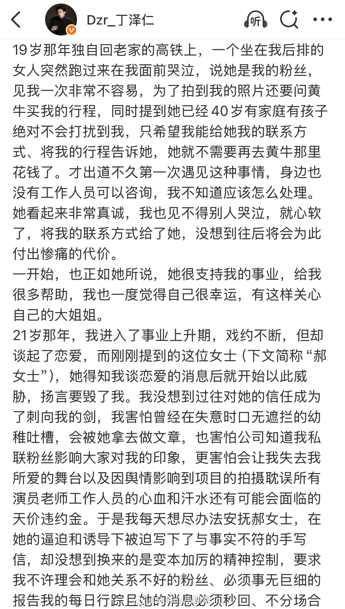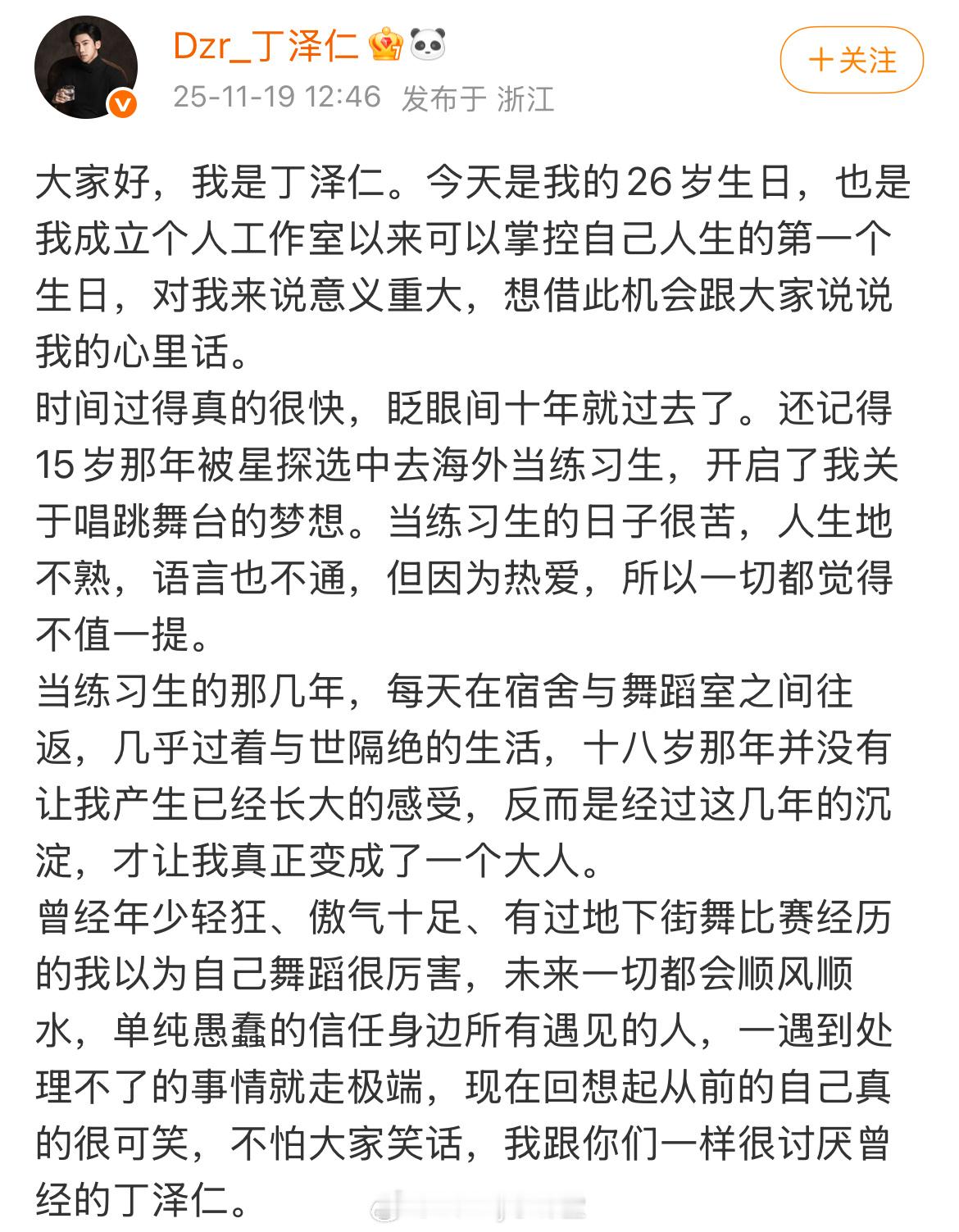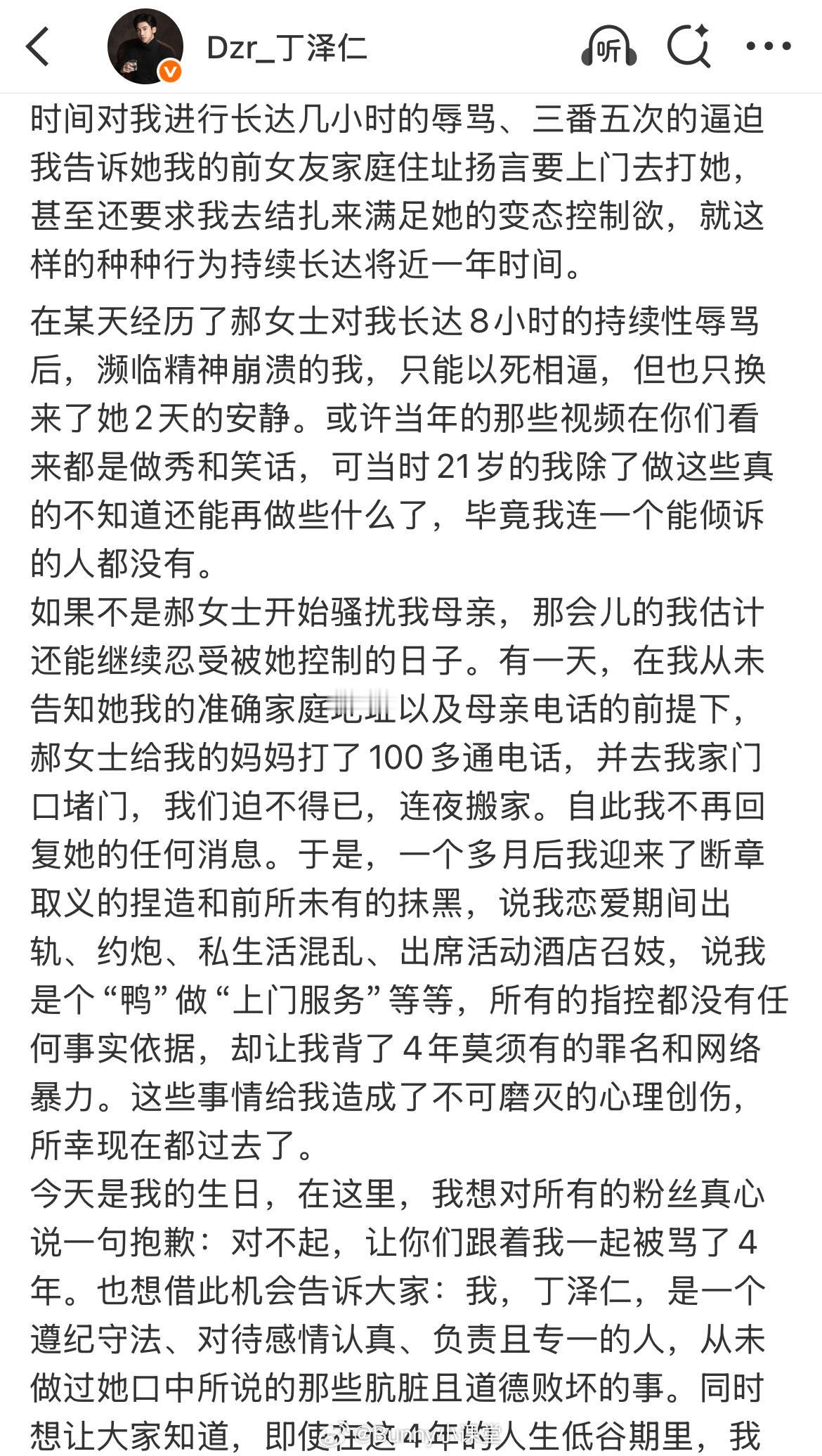 丁泽仁发长文再谈“唯一的姐”,称在19岁那年认识了一个“大姐姐”粉丝,还把自己的联系方式给了她,几年后丁泽仁谈恋爱,这位“大姐姐”开始用各种方式对他进行精神控制,还骚扰他的母亲。当丁泽仁连夜搬家逃离后,“大姐姐”开始造谣抹黑他,对此他表示从未做过这些肮脏且道德败坏的事。怎么突然发长文了……