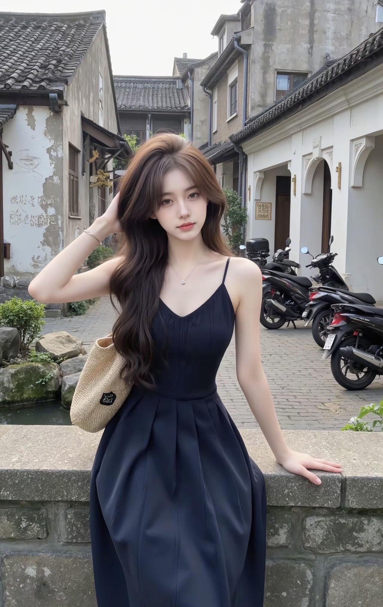 巷弄里的白墙黛瓦浸着水汽,乌篷船的影子晃在水边。穿一身墨蓝吊带裙,藤编包坠着软乎