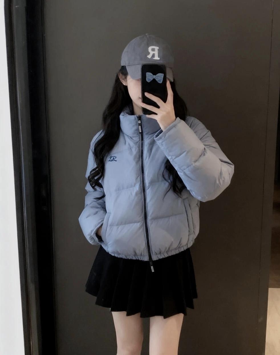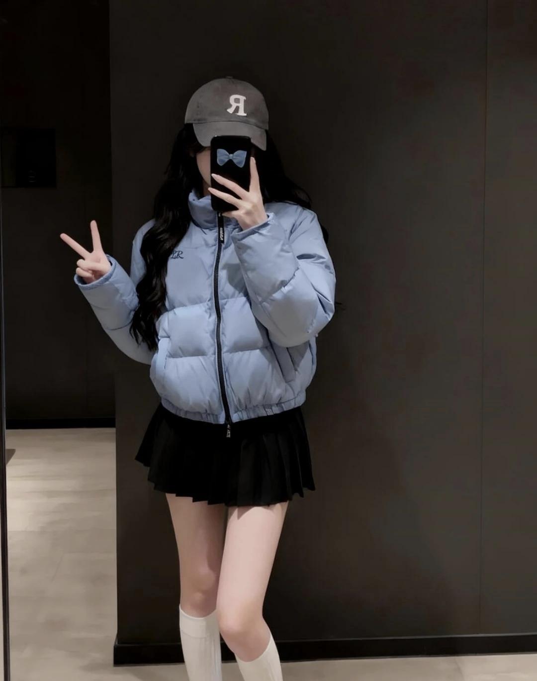 浅蓝棉服裹住温柔,黑裙配长袜踩准松弛感节奏。帽子上的白R是今日份随性标识,对着镜面按下快门,把初冬的轻甜氛围打包收藏~