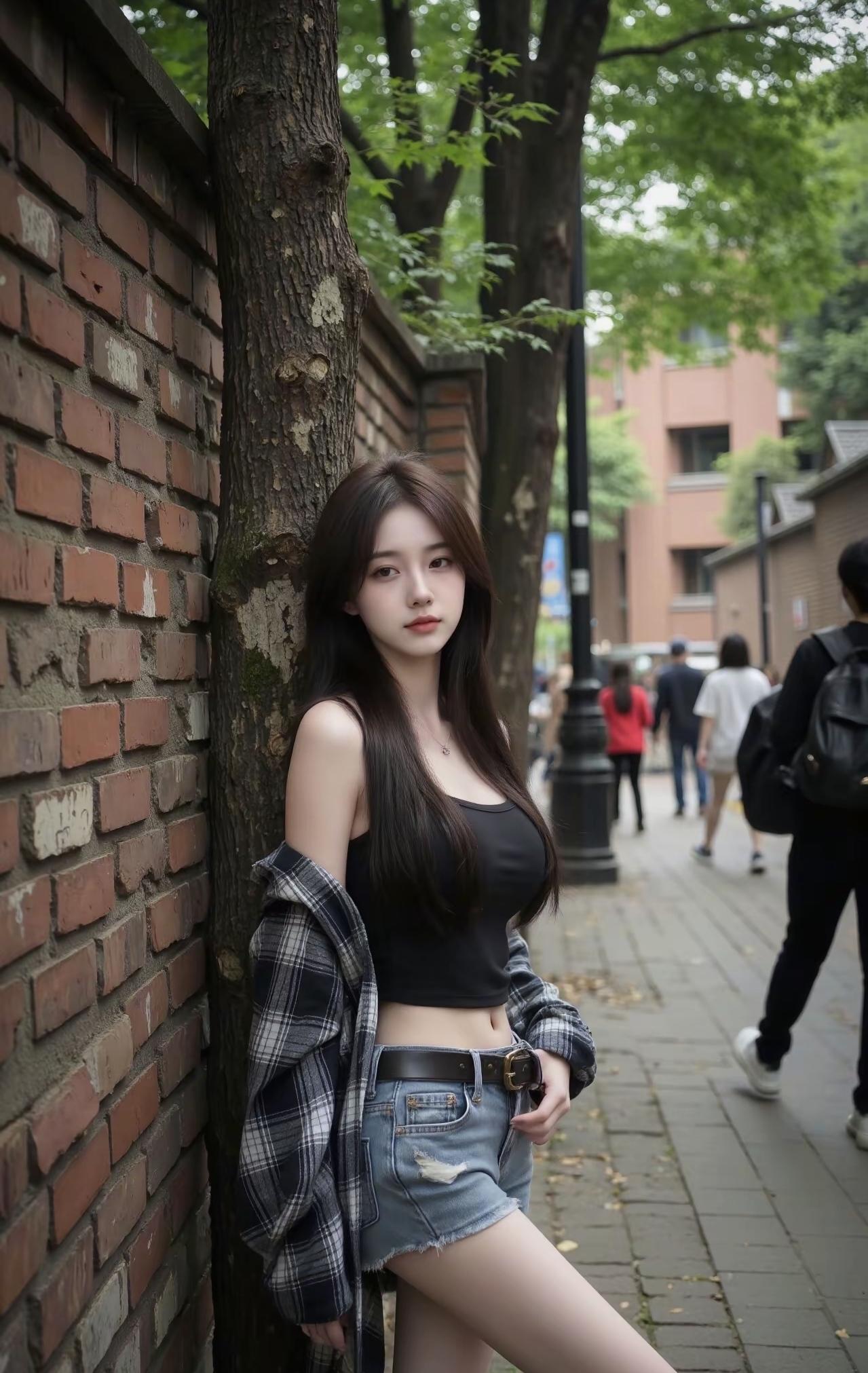 砖墙的温度裹在风里,黑吊带刚好接住夏天的松弛感。随手搭着的格纹衫,是没说出口的“今天很随性”。