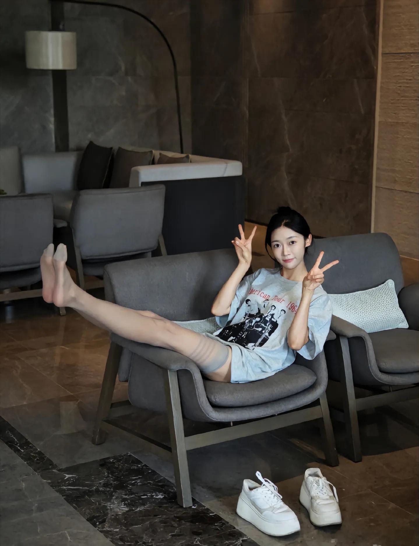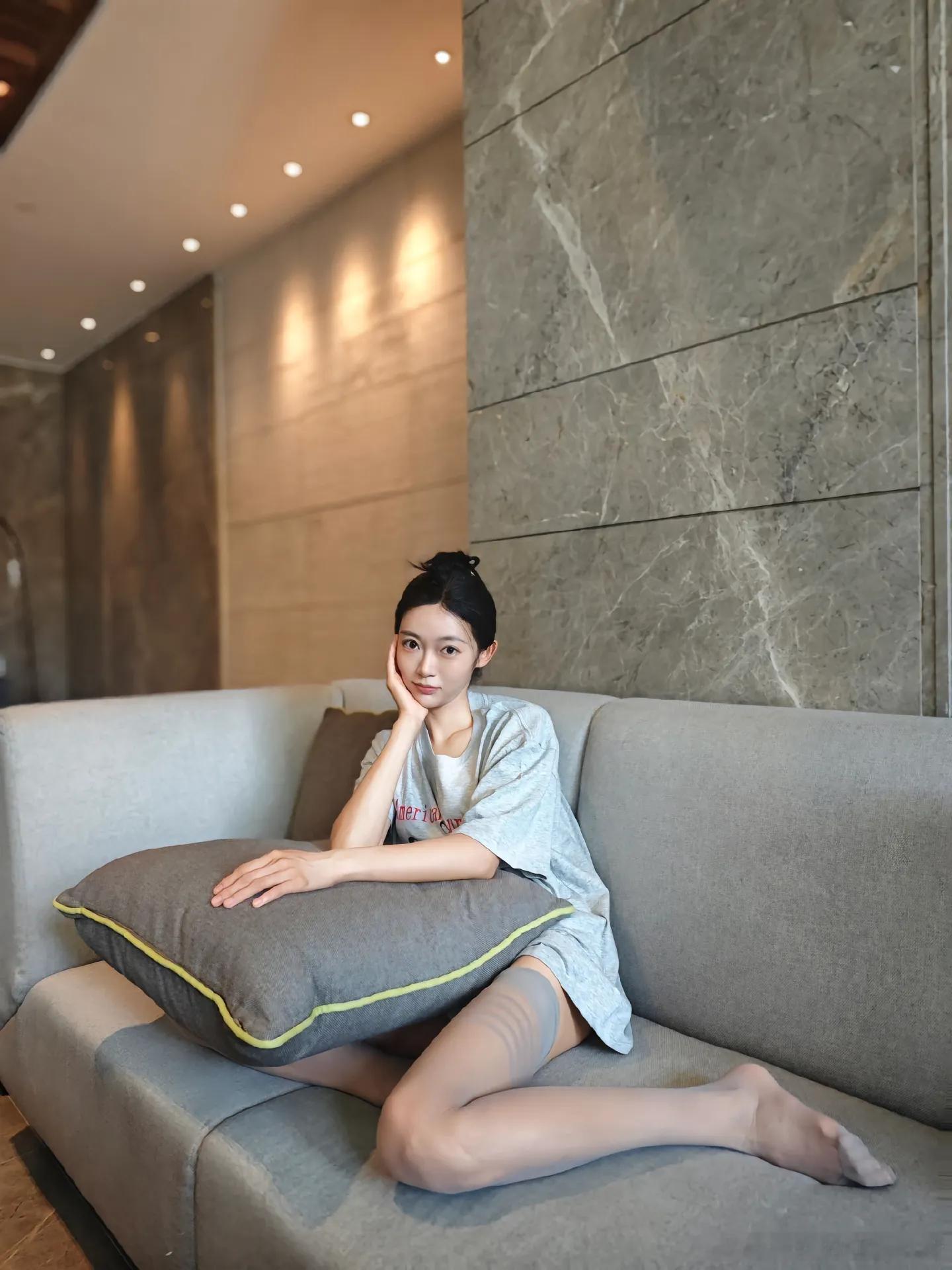 黑西装与白衬衫是职场的铠甲,却在柔软的沙发上卸下了锐利。薄透的黑丝裹着双腿,是藏