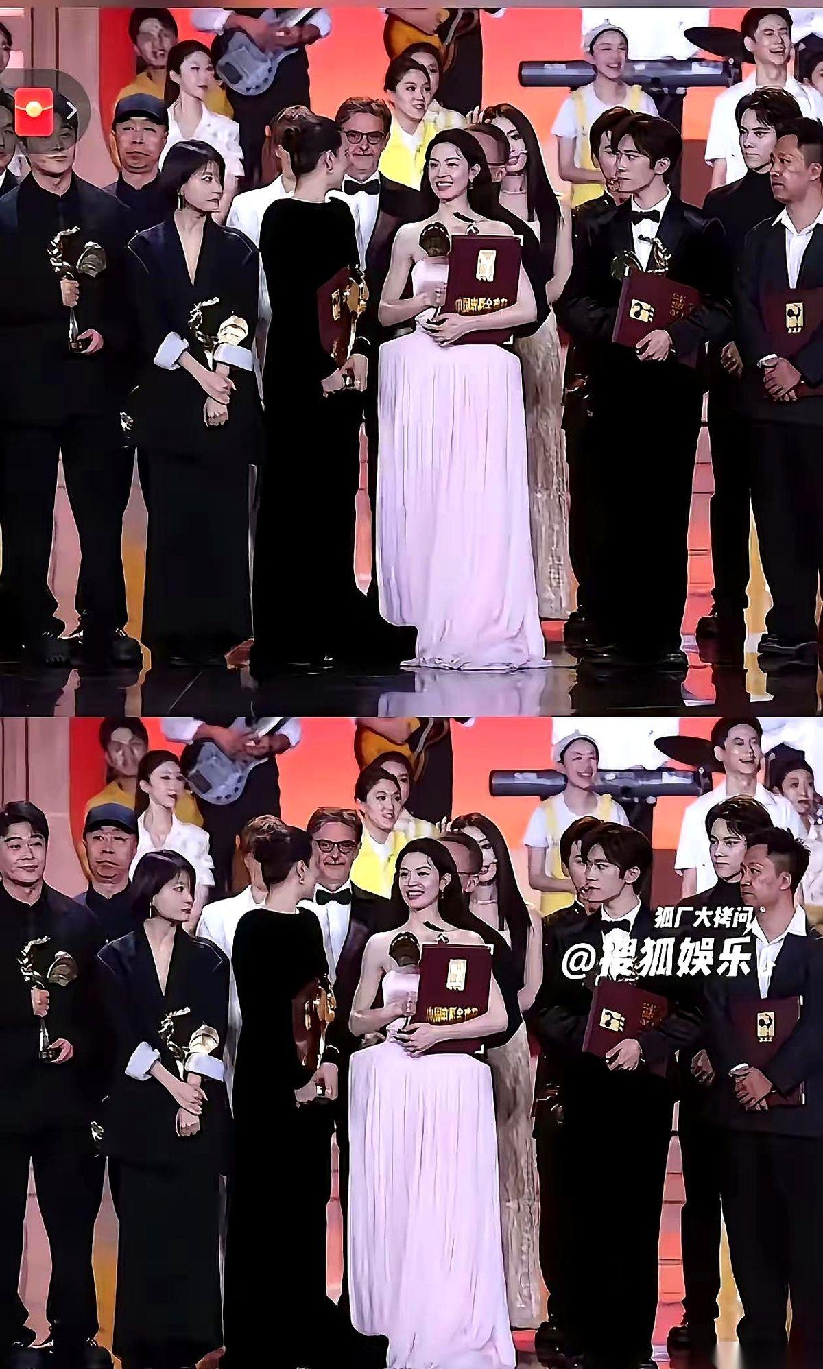 讲真,这张合影我能看一年。 黑压压的一片,都是圈里的大佬,个个穿得安全又正确。 然后,“Duang”一下,正中间,冒出来一个粉红色。 笑得那叫一个甜,甜到你觉得她毫无攻击性。 但你再仔细品品那个位置——最佳女主角和最佳男主角,像俩保镖似的,一左一右给她护法。 好多人都在问,一个最佳女配,凭啥站C位? 这不合规矩啊。 哎,我的朋友。 你什么时候产生了“规矩”是给想赢的人定的这种错觉? 你以为是巧合?是她不懂事? 别天真了。 在这种名利场,每一个微笑,每一个站位,甚至每一根头发丝,都是精心计算过的。 那身粉色,就是她的战书。 那个位置,就是她的野心。 她就是在用最大分贝告诉你: 配角?那是暂时的。 今天我站在这里,明年,这个奖我也要。 这点明晃晃的企图心,多好啊。 比那些藏着掖着、背地里使劲的,坦荡多了。