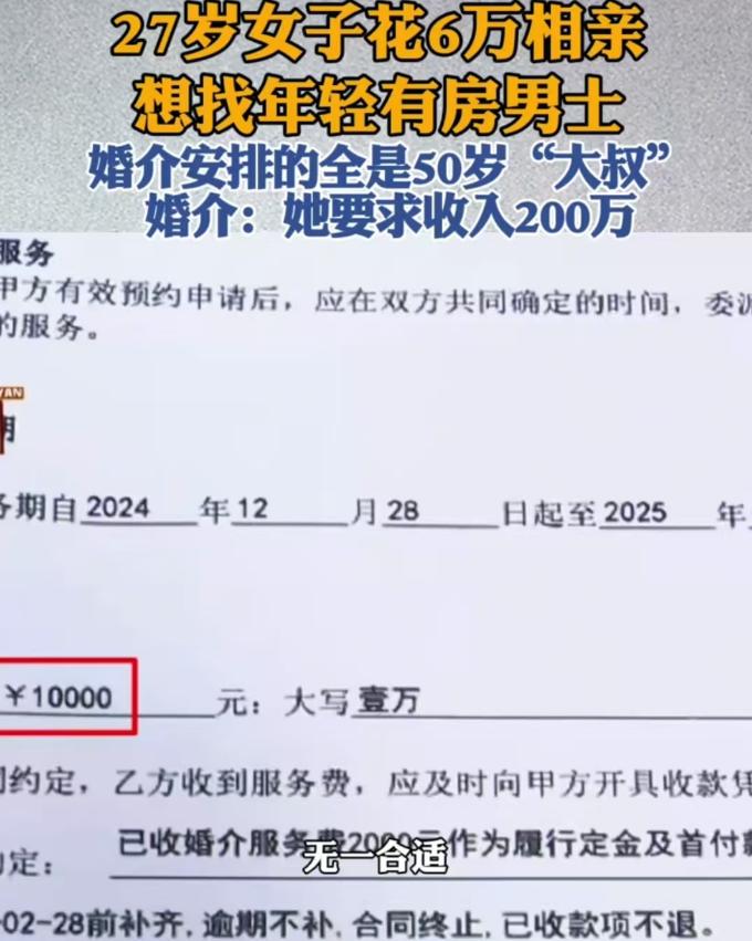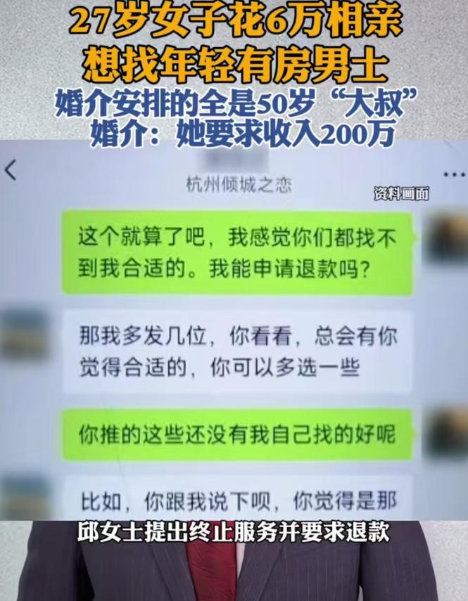 杭州,27岁女子花6万相亲,想找年轻有房男士,可婚介公司安排的全是50岁“大叔”!女子认为自己被欺骗,要求退款!婚介公司:“她要求年收入200万,年轻男人有几个能达到这个收入?”   事情得从去年12月说起,邱女士觉得身边男性条件普通,刚好刷到当地婚介的广告,说能“精准匹配优质资源”,脑子一热先交了1万。   可第一波介绍的3个男士,不是四十好几就是奔五的年纪,跟她“年龄差距10岁以内”的要求差着辈儿。   本想就此算了,婚介的人又找上门,把胸脯拍得震天响:“再补5万升级两年套餐,资源直接上一个档次,保准给你找年轻精英,”邱女士架不住劝,咬牙又交了5万。   没成想新介绍的3个人依旧是大叔辈,这下她彻底炸了,当场要求退款。   婚介刘经理倒显得理直气壮,面对找上门的调解员,张嘴就怼:“她要年入200万的年轻男人,杭州城里能找出几个?符合收入条件的基本都年纪大,她又看不上,我们能咋办?”   这话让邱女士更火:“明知做不到,为啥当初哄着我加钱?这不是骗钱吗?”   其实这套路早被业内人点破过,婚介先拿“优质嘉宾”信息勾着你,摸清经济状况后就开始催付费,收了钱再用不符合要求的人选敷衍,等你不满意就劝着升级套餐,一步步套钱。   并且更坑的是,合同里全是“匹配优质对象”这类模糊话,真要维权根本抓不到实锤。   这事传到网上,网友说得一针见血:“想用6万撬动200万的生活,本身就不现实,”也有人骂婚介没良心:“明知道需求不切实际,还骗着人花钱,这就是利用焦虑赚钱。”   其实说到底,这出闹剧里没人是赢家,邱女士把婚姻当成了物质置换,忽略了感情本质;婚介公司丢了诚信,把“鹊桥”变成了“猎场”,最后婚介虽说愿意协商退费,但邱女士浪费的时间和精力,哪能补得回来?   现在不少婚介都在玩这套,靠制造年龄焦虑、夸大资源骗钱,合同里还藏着各种“霸王条款”。   还是真希望监管能再严点,也给想通过婚介找对象的人提个醒:找伴侣得脚踏实地,选婚介更得擦亮眼睛,别让真心和钱包都打了水漂。