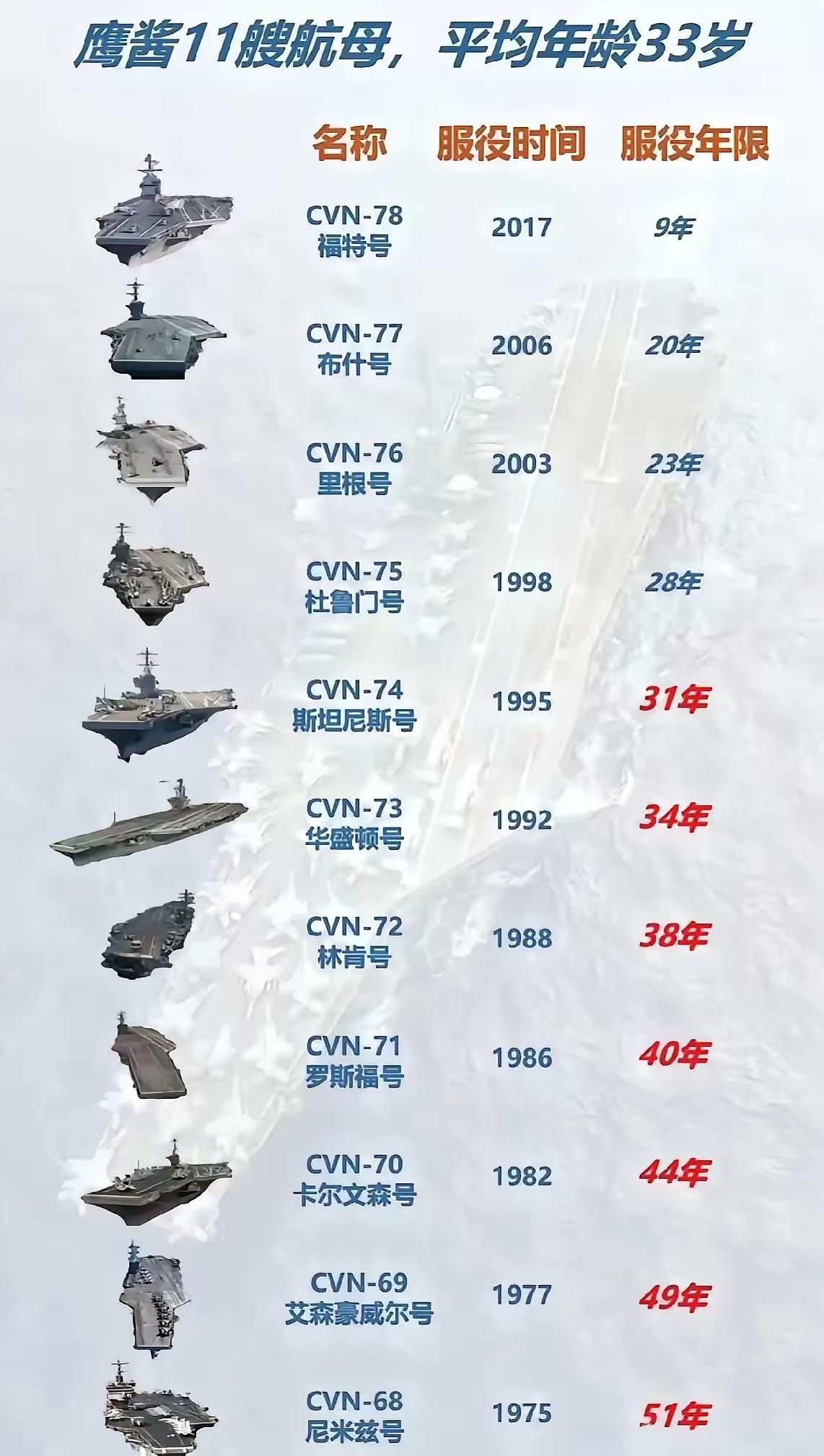 鹰酱航母平均舰龄33岁,更新频率从2年,到5年,到如今已接近10年一艘的频率了。 问题是,福特舰已经服役九年了,如今还没有形成完整的战斗力,如果按照懂王的指示,把电磁弹射改回蒸汽弹射,那还不知道需要再折腾几年。 更遑论电子设备和雷达设备恐怕永远都无力追逐东方的脚步了。