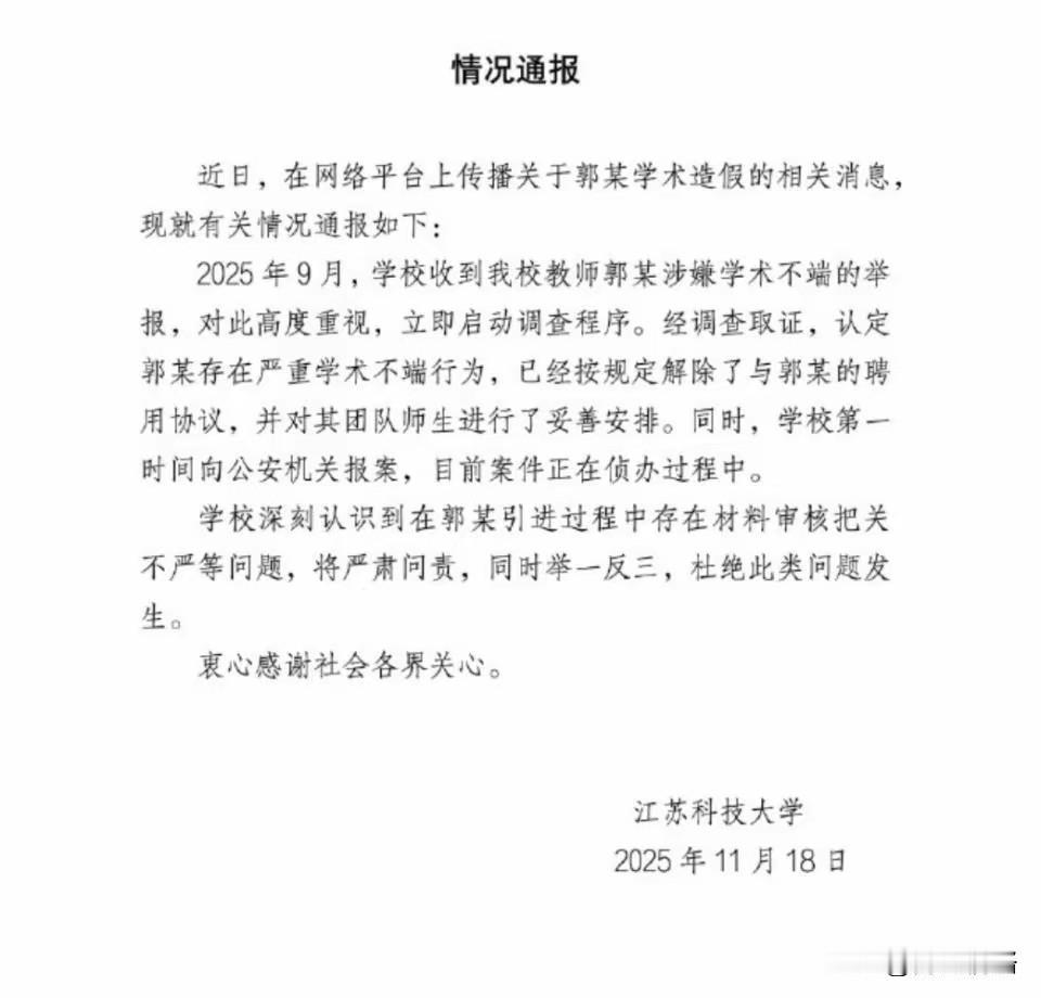 我的导师被抓了,我才知道!那些年我们跪拜的学术神只是个高中生。 博士生到了学校打不通自己导师的电话,看了实验室也找到人,微信也不回,问了学校,学校都说不清楚人去了哪里。 还没过多久,博士生等来的不是课题进展的通知,而是一条令人不敢相信的消息,他们的博士生导师,那个在学术圈里面频频露脸,被称为“首席科学家”的教授,其实就只有高中学历。 这不是段子,而是最近在江苏科技大学真实发生的一场学术地震。 这个叫郭某的教授,曾经是材料科学与工程学院的明星人物。他公开的简历上面写着海外博士的背景,而且自己名下还挂着170多篇SCI论文,主持过国家自然科学基金项目,科研的经费高达了上千万元。到了今年的年初,他还被列入了中科院院士候选人的推荐名单里面,风头正盛啊。 结果这一切,全是假的。 他没有博士学位,也没有什么海外经历,甚至连最基本的本科学历都是伪造的。一个本来应该在工厂或者流水线上工作的人,居然坐在了高校教授的办公室里面,而且还带着博士生、评项目、出席各种各样学术会议,甚至还指导学生冲击顶级期刊。 他就用一张假简历,骗过了层层审核,也骗过了整个学术体系的信任。 而且现在最让人很难接受的,是那些被蒙在鼓里的学生。他们把导师当作学术路上的引路人,熬夜的改数据、反复的推模型、一篇论文改十几遍又改,只希望不辜负郭教授的期望。结果现在,曾经那些什么所谓的指导,有多少是建立在真正的学术能力之上的?那些被引用的研究成果,又有多少是值得他们怀疑的? 现在导师被带走调查,课题又只能停止,现在论文也难发,他们毕业的希望怎么办。现在有很多人都在社交平台上评论,我拼了命想成为优秀的科研人,结果我的导师根本不是个真正的学者。 我们痛骂郭某的无耻与贪婪。一个人靠着谎言混进了最高的学府,偷取荣誉和资源,结果最终把一群真正求学的学生拖入了深渊,这种行为必须受到惩罚。 但现在的问题是,一个高中毕业生,是怎么通过高校招聘的?职称评审、导师资格认定、项目申报,哪一个都没拦住他。那些厚厚的申报材料和层层的签字审批表还有公开公示的信息,为什么没有发现一点破绽? 更夸张是,这套机制可能并不这么的简单。在一些高校里面,重成果和轻过程的评价导向早已经在他们那里根深蒂固了。反正只要能拉来项目和发得出论文能拿得到头衔,其他都可以灵活处理。于是,就有人靠着挂名刷论文,有人靠着包装走捷径,甚至有人直接干脆造假来上位。 现在学校已经通报了解聘郭某,而且已经承诺了会妥善安排受影响的师生。这当然是必要的补救措施,但就处理一个人,是不是不够。 学术不是舞台,也不需要什么演员。它需要的是真实和严谨和敬畏。一个教授的身份,不是包装出来的光环,而应该是多年积累的底气与担当。 这件事情里面,不是出了个假教授,而是那些学生,他们把最重要的几年时间,托付给了一个连基本资格都没有的人。 否则,今天倒下的只是一个骗子,明天塌下的,可能是整个社会对知识和教育的信任。