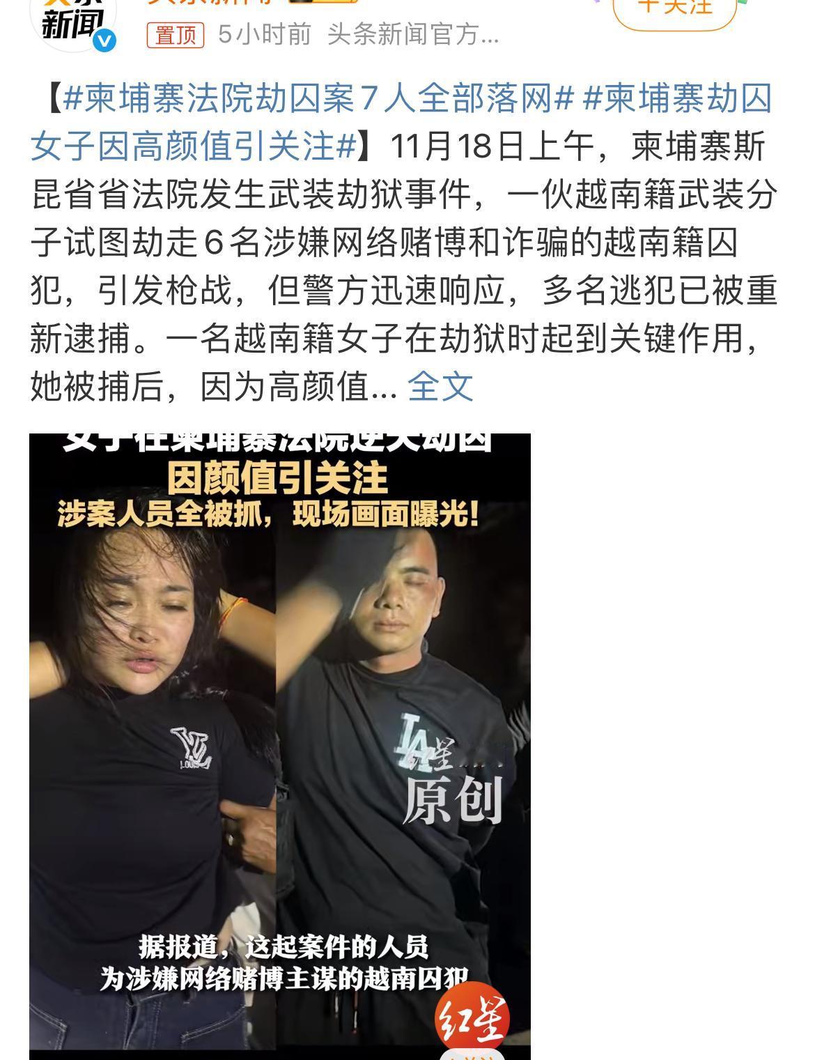 越南女子在柬埔寨法院门口单枪匹马劫囚6名嫌犯,把枪递给其囚犯男友后引发枪战,很多人夸她是“江湖第一大嫂”但是其鲁莽的行为搭上自己不说,还让6名囚犯罪加一等,经大嫂这么一操作,这一伙人的刑期也变得遥遥无期了