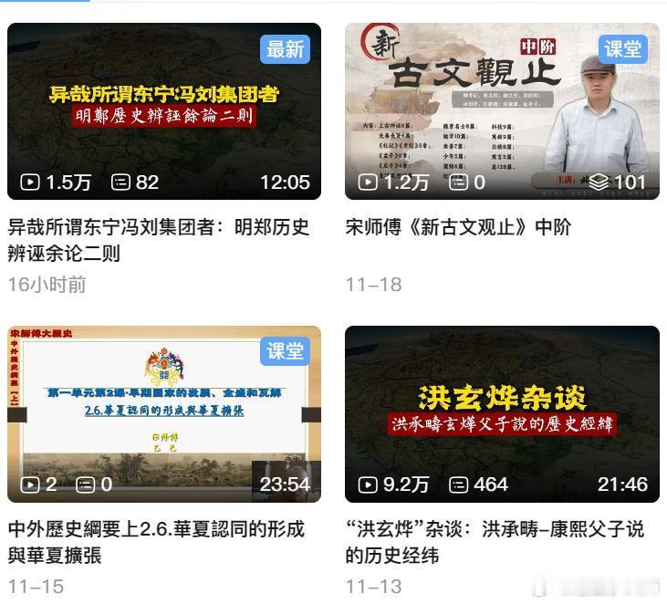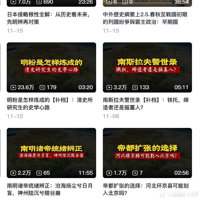 有人说,吃瓜蒙主昨天恢复更新的第一个视频简直就是念稿子。我建议你去看另外一个大V北大宋师傅。人家正经清史专业毕业的。今年5月的视频见图1。然后现在的视频看图2,图3。看标题就可以,不必多说。至于北大宋师傅为什么在北大读的本科,硕士是去的中国人民大学。呵呵。听人说过几句。与之对照的是某在论文上签署网名的。那位进了大学,直接拿奖学金,一路绿灯,难道不是有人给铺路吗?有的人还问我:你没有“老男孩的关系网”(Old boys' network),你就不求职了吗?你说得对,给你点赞