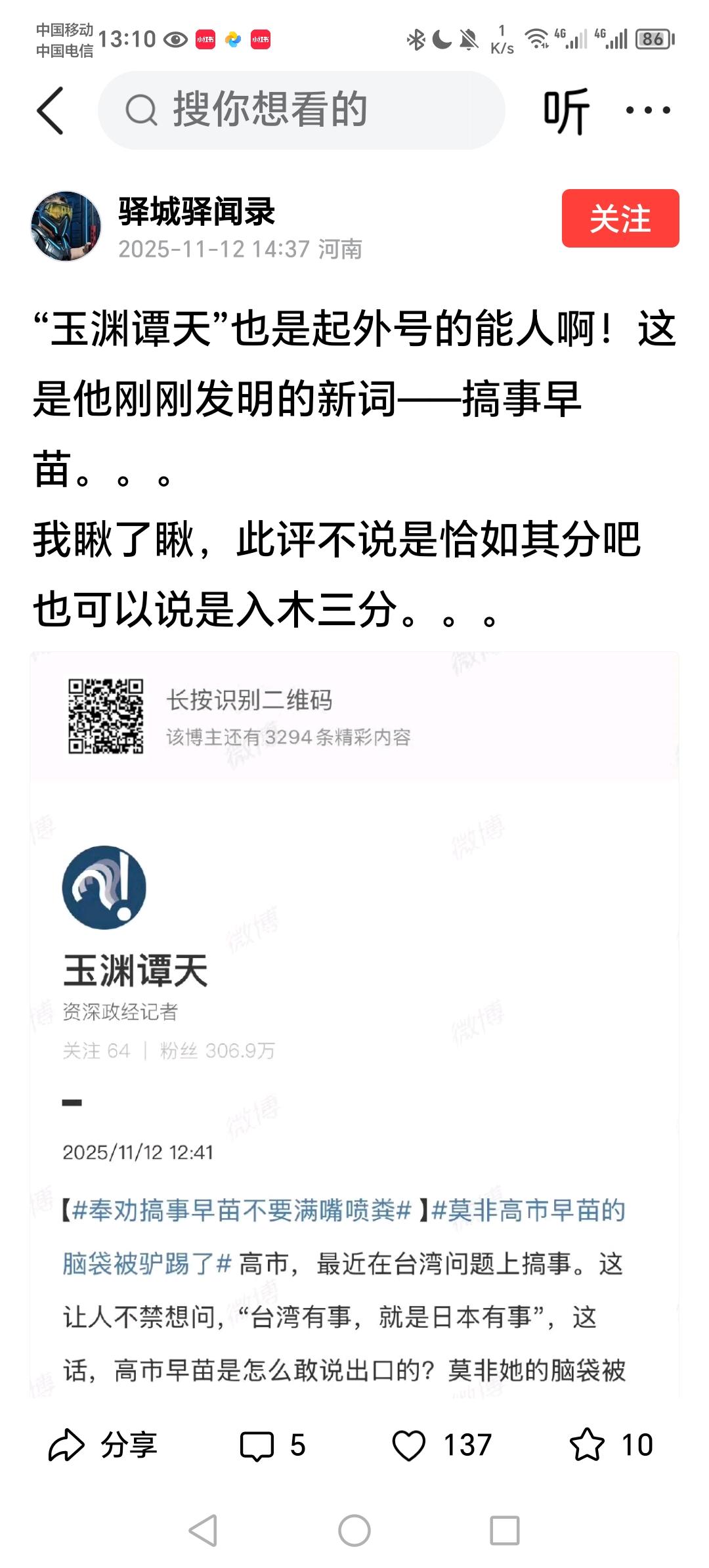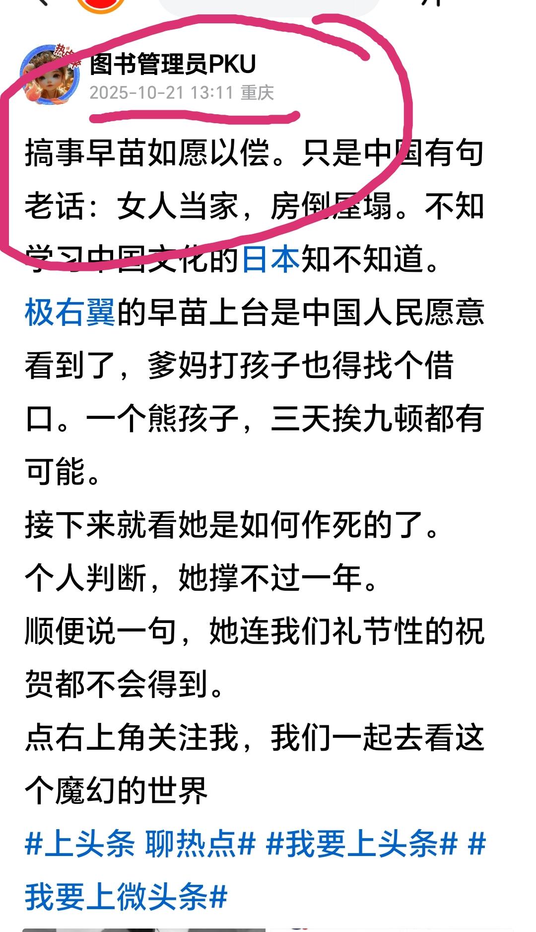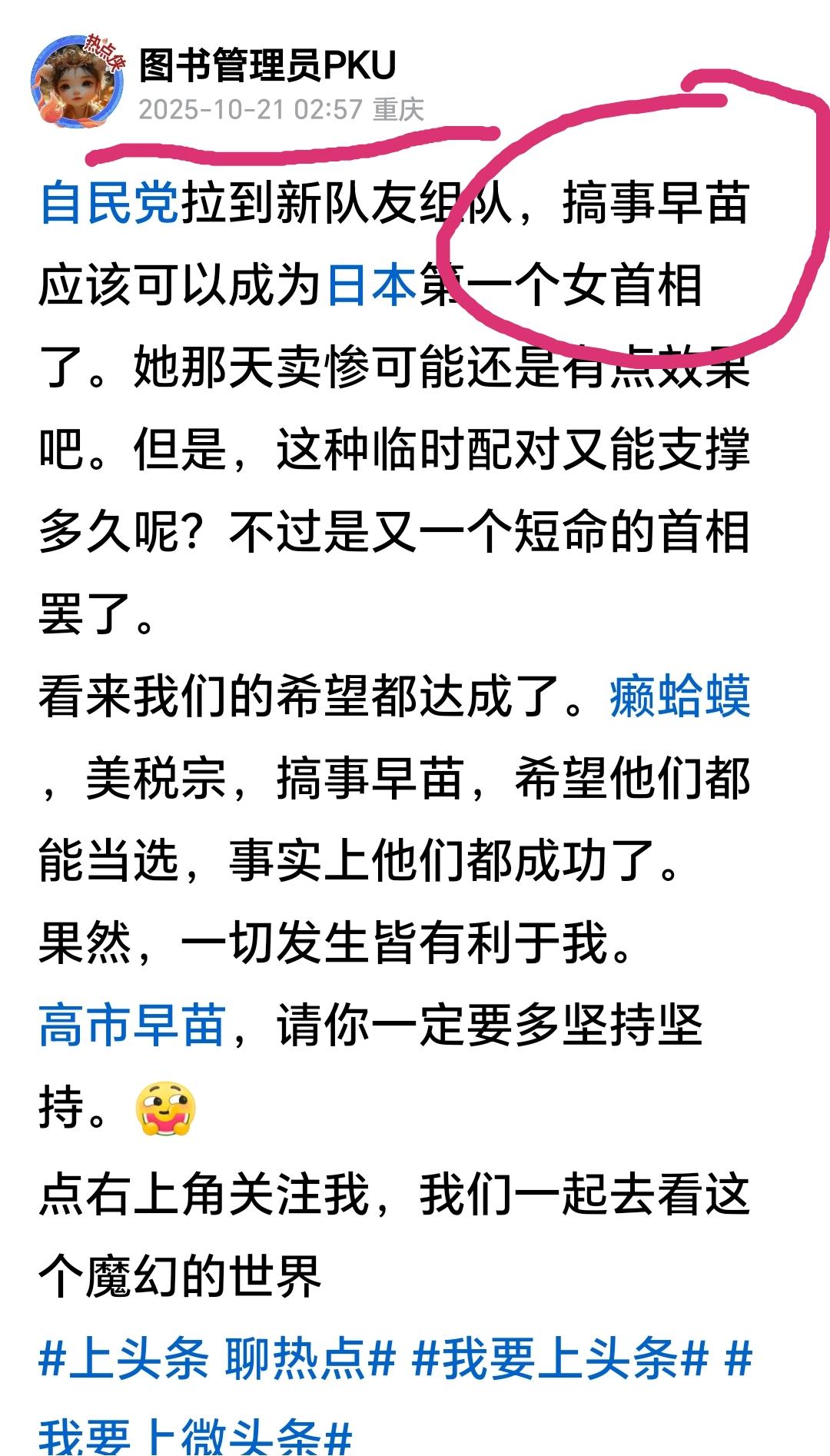 “搞事早苗”这个原创我必须要认领一下,并不是玉渊潭天发明的哦。还在高市当初卖惨她可能成为第一个当了自民党总裁却当不上日本首相时我就给她配对了这个名字。[偷笑]现在已经给她进化到搞事毒苗了。@驿城驿闻录 接下来就要看她能撑多久了,现在已经有众多的前首相出来批她了。 希望她坚持住。[笑哭] 要不然我们环日本三军军演怎么搞呢,你说是吧? 点右上角关注我,我们一起去看这个魔幻的世界