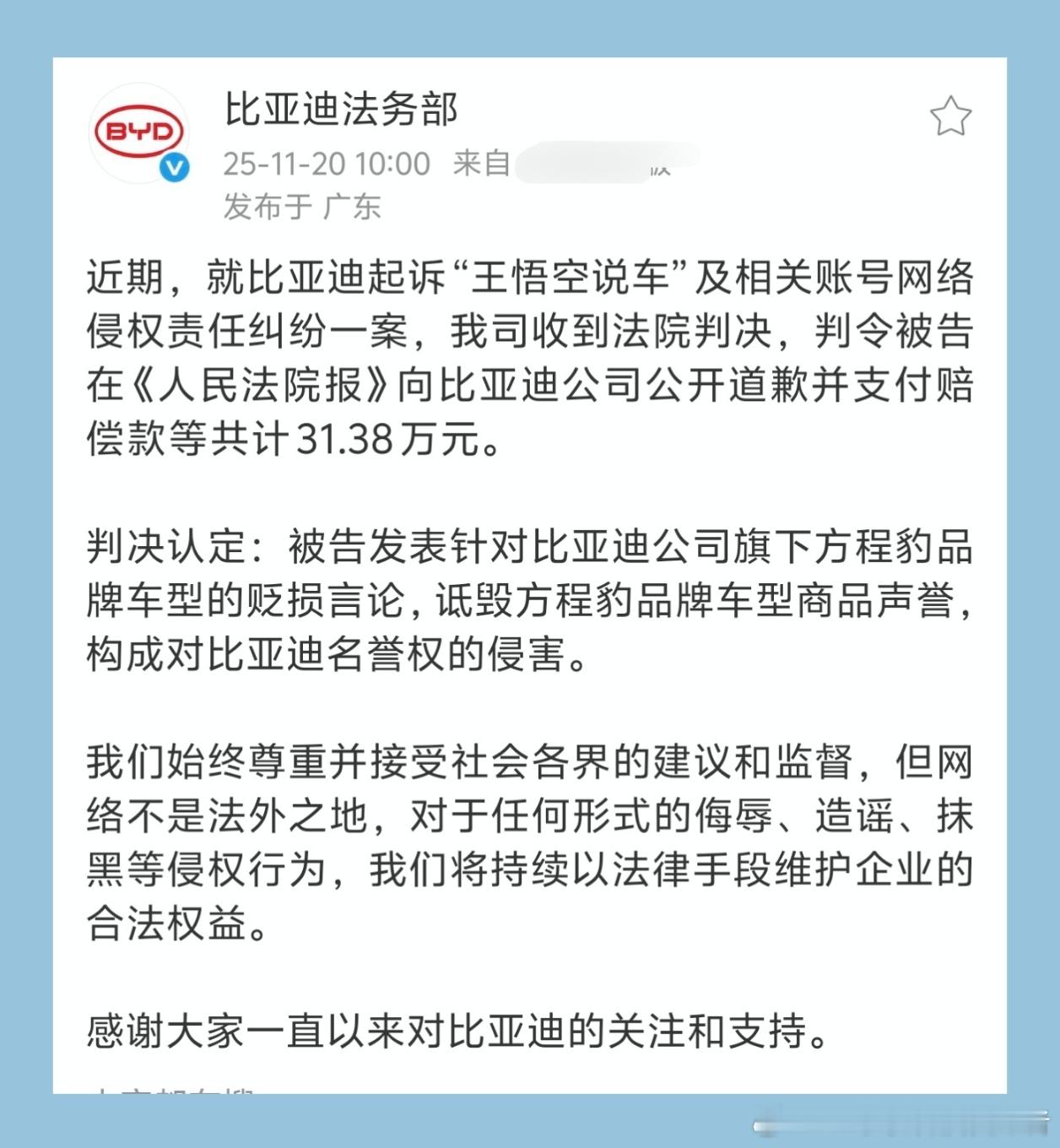 重拳出击!比亚迪法务部官宣,某博主被判赔偿30多万。比亚迪起诉“王悟空说车”最新进展来了,根据法院判罚,后者向比亚迪公司公开道歉并且赔偿31.38万元。主要这家伙口无遮拦,对方程豹品牌持续输出一些负面评价。这个判罚金额没有百万级别,但也还好,他自己的账号也接二连三被封禁。这就是吃黑流量的代价。理性评价根本就没事,非要带着主观情绪去评车,这本身就违背了车评人的初衷。理性的挑缺点大家都能接受,还有扳手事件,这是正常人能做出来的事吗?网络不是法外之地,要为自己的行为负责。