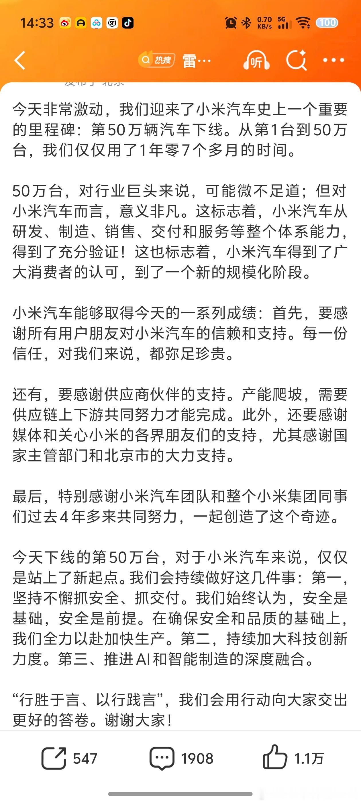 雷军说,今年小米汽车预计交付超过40万,超能没问题的话基本就稳了。现在小米不缺订单,主要是能保证交付就行。而且,雷军也表示会做好一些事情,又提了一遍安全是前提,抓安全和交付。大家觉得,小米汽车未来一个月能保持多少交付量呢?